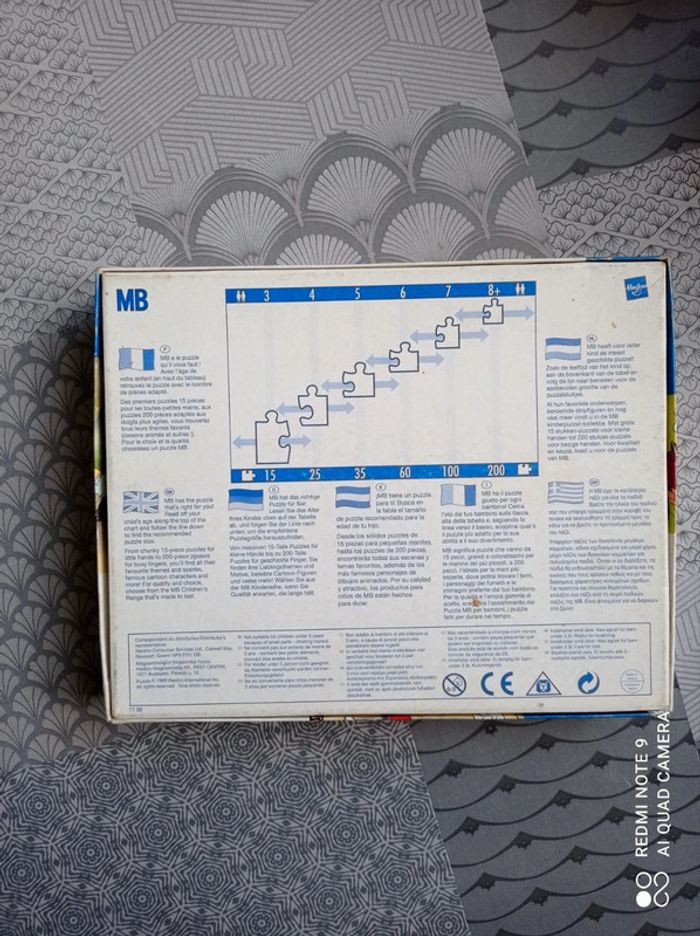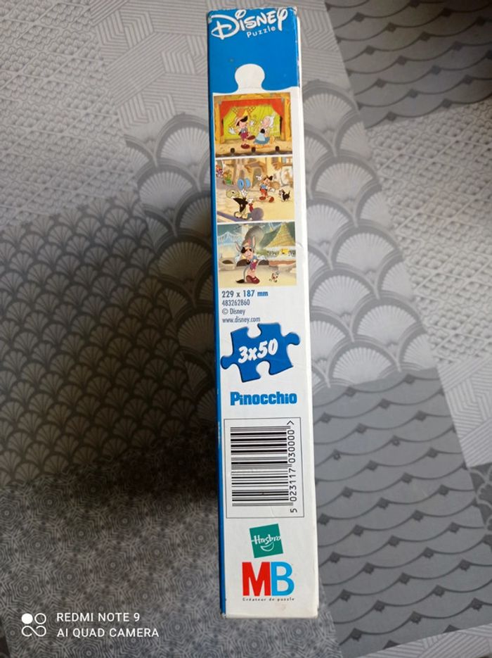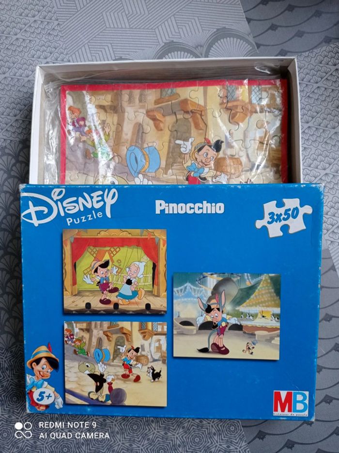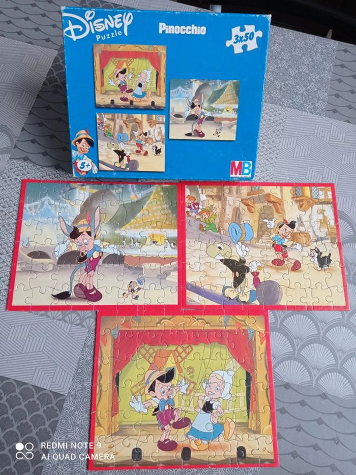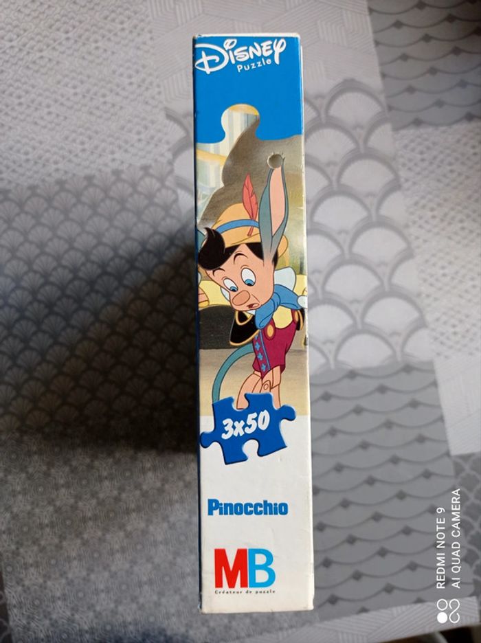 Boîte contenant 3 puzzles de 50 pièces chacun. Marque MB. 3 puzzles Disney de Pinocchio, pour enfant à partir de 5 ans. Les pièces des 3 puzzles sont faciles à différencier grâce aux motifs différents au dos des pièces : quadrillage noir sur fond blanc, ronds noirs sur fond blanc, ronds blancs sur fond noir. Puzzles et boîte en très bon état, aucune pièce manquante. #disney #pinocchio #disneypuzzle #puzzlepinocchio #puzzle50pieces #3puzzles50piecespinocchio #puzzle5ansetplus #puzzlemb50pieces #3puzzles50piecesmb #jouetenfant5ansetplus #5ansetplus