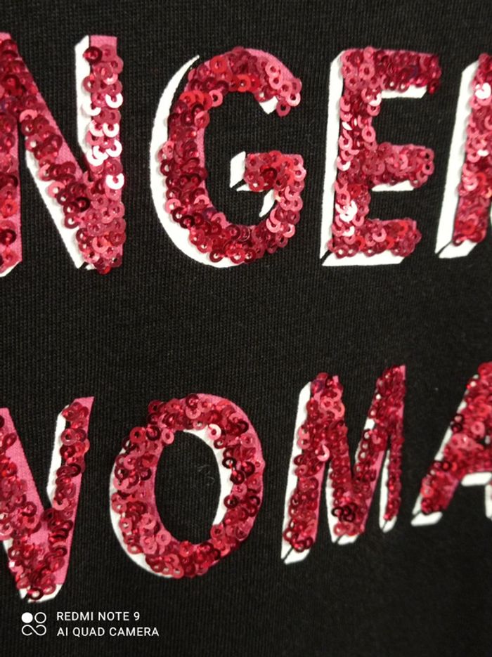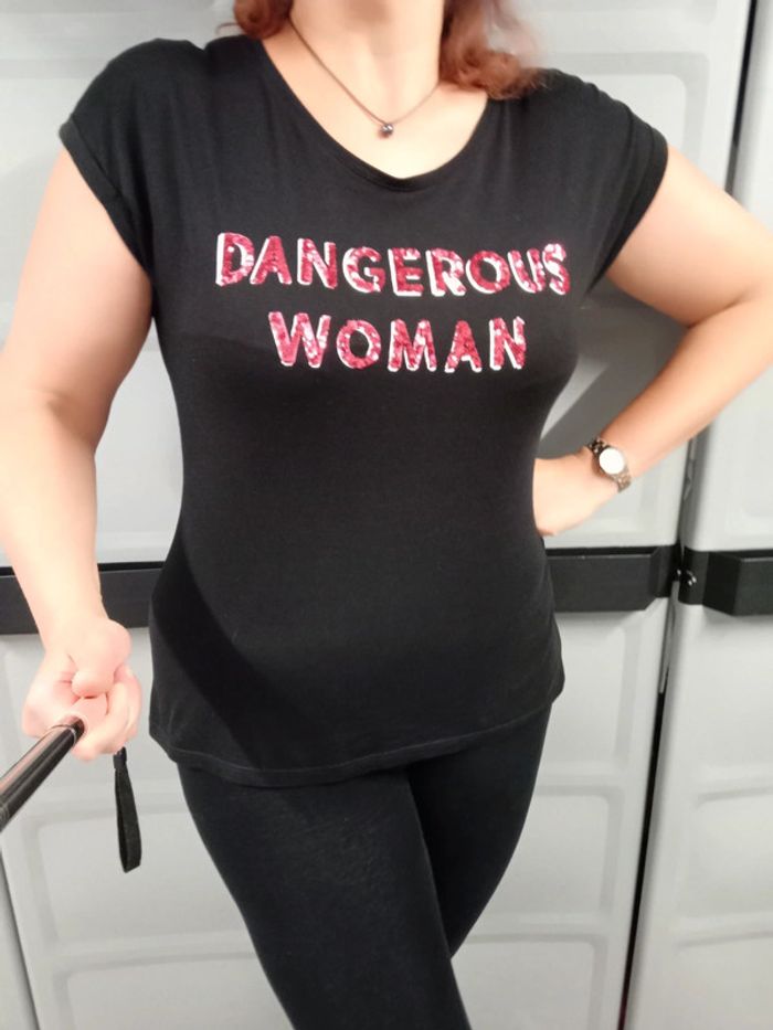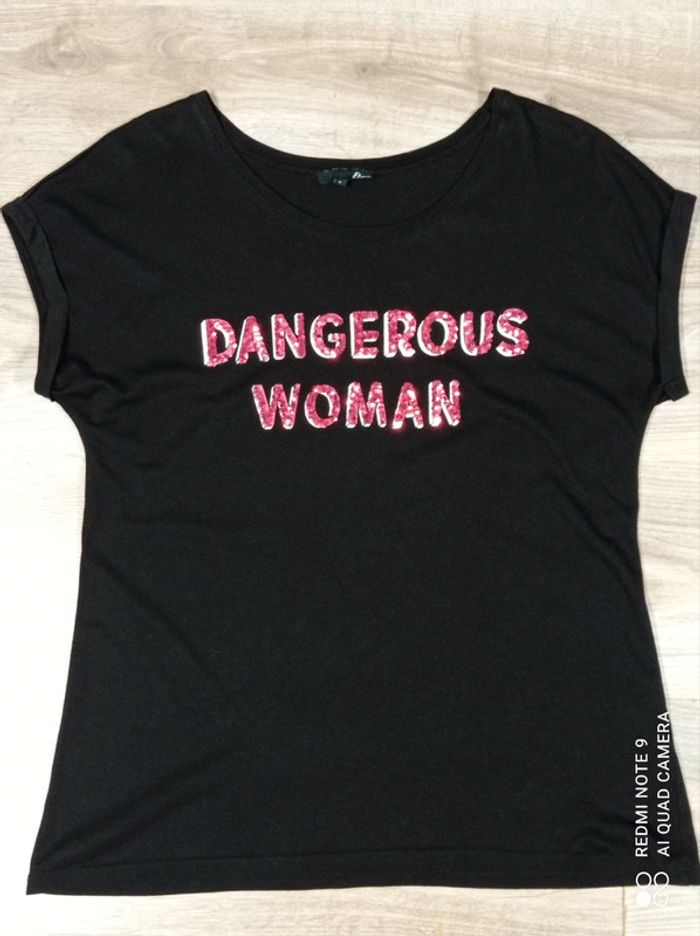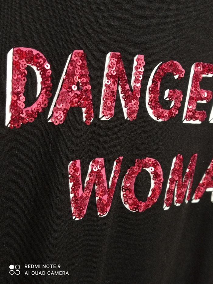 Tee-shirt noir avec inscription "DANGEROUS WOMAN" en strass rouges. 50% coton 50% modal Marque Etam , taille L En excellent état. #etam40 #teeshirtasequins4042 #etam42 #etamlarge #teeshirtetam40 #teeshirtetam42 #teeshirtastrass4042 #teeshirtstrasslarge #teeshirtfemme4042 #teeshirtstrass #dangerouswoman #femme4042