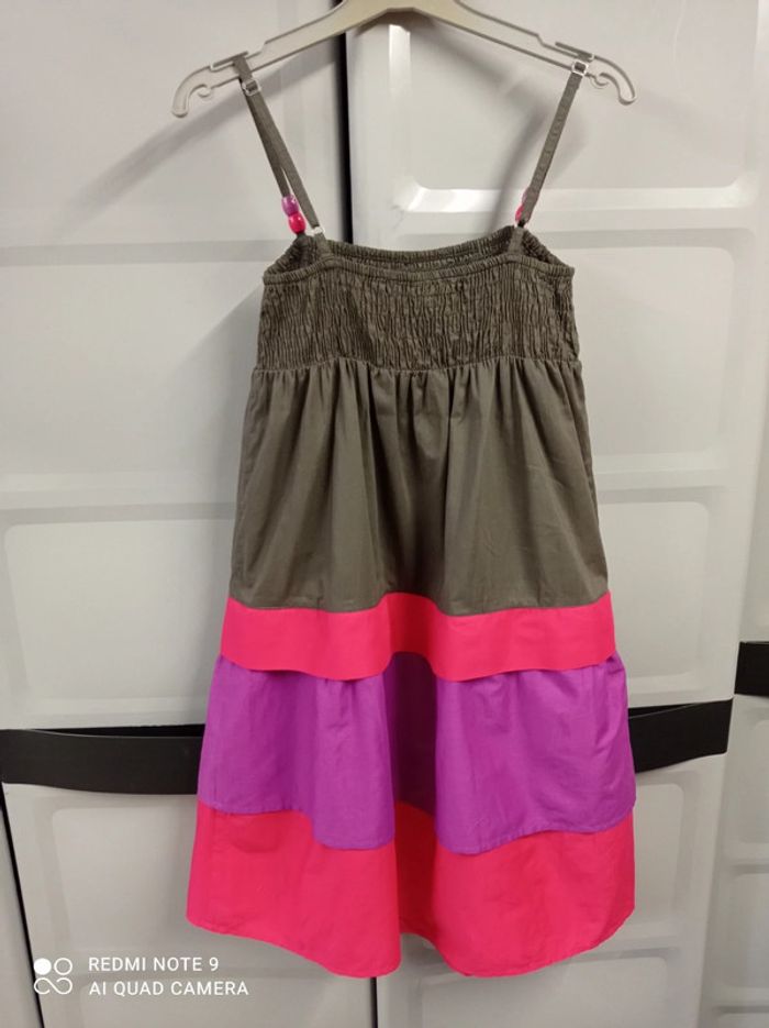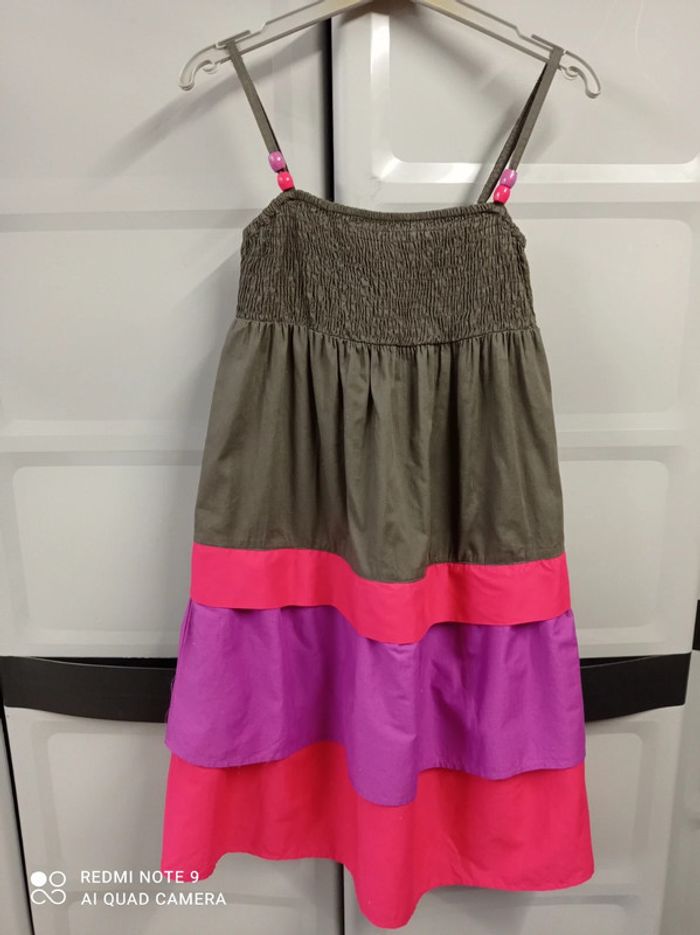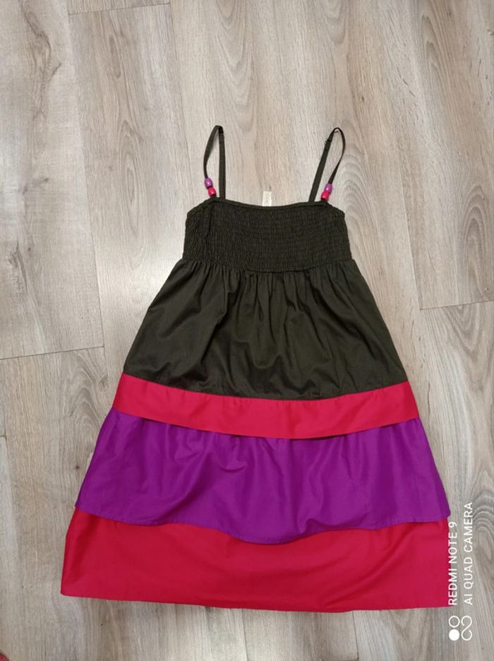 Jolie robe à bretelles, couleurs taupe/fushia/lilas. Bretelles réglables, 2 perles aux couleurs de la robe sur chaque bretelles. Haut entièrement smoké , plusieurs volants. Tissu 100% coton. Hauteur robe 75cm (sans les bretelles). Marque SPRINGFIELD, taille 34 / XS . ROBE NEUVE qui porte encore l'étiquette antivol (non découpée). Jamais portée ni lavée. Achetée 39€. #springfield #springfieldfemme #springfieldfemme34 #springfieldxs #springfield34 #robespringfield34 #robeété34 #robeétéXS #femme34 #femmeXS #étéfemme34 #étéfemmeXS #robeabretelles34 #robeabretelles16ans #robeabretellesado #robeabretellesavolants
