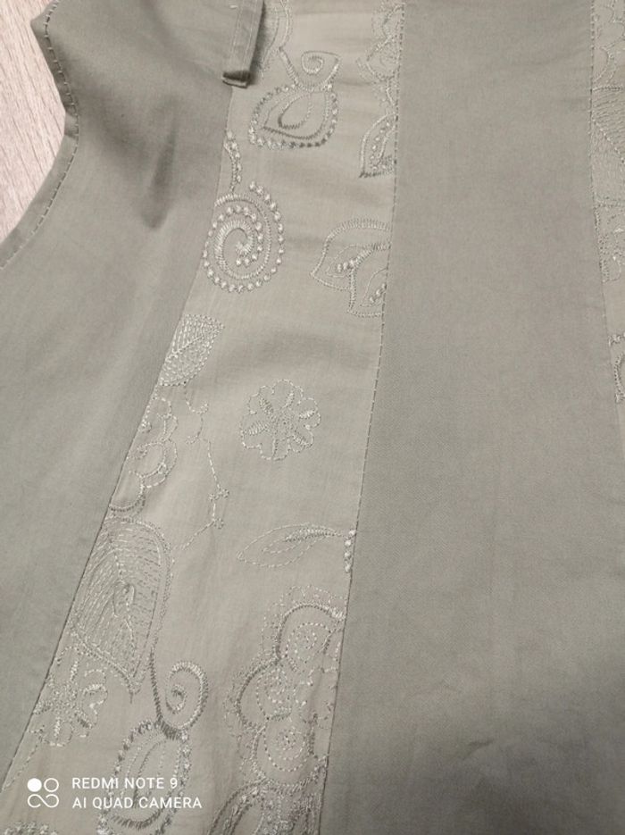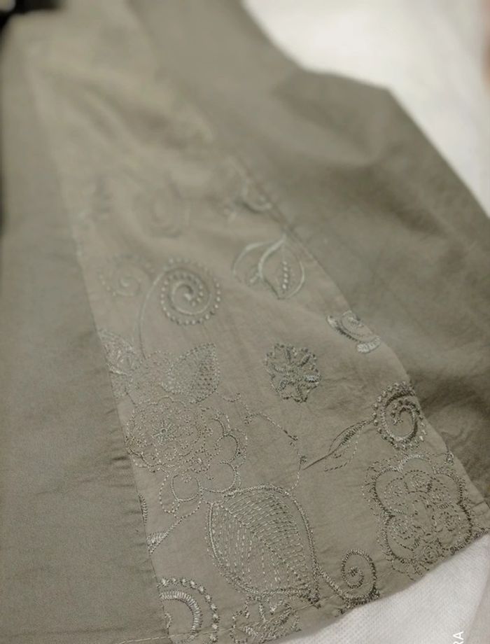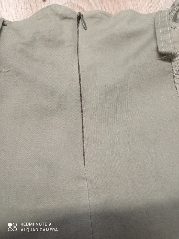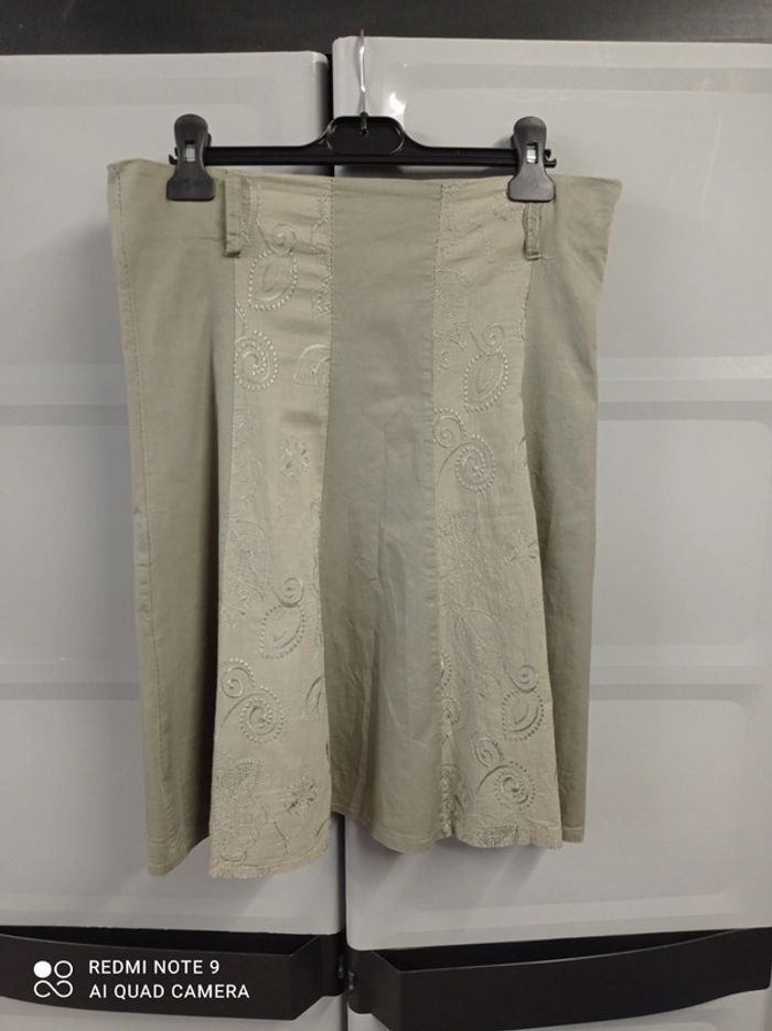 Jupe tons kaki : bandes kaki foncé uni et bandes kaki clair avec broderies. Fermée par zip invisible . Passants pour mettre une ceinture . Tissu extensible : 95% coton 5% elasthane. Longueur jupe 56cm. Taille 3 / L / 40 Très bon état. #jupe kaki #jupemidi40 #vertkaki #vertolive #jupevertolive #vetementfemmevert #couleurkaki #couleurvertolive #jupekaki40 #jupe40 #jupeévasée40 #femme40 #kaki #jupeàpanskaki40