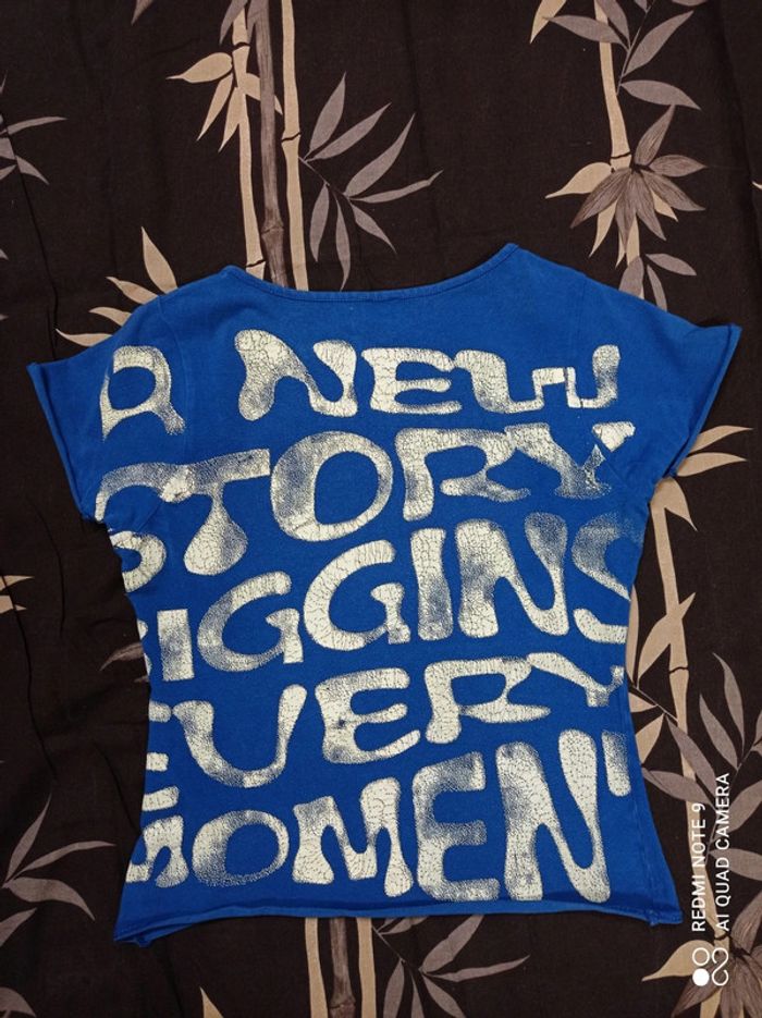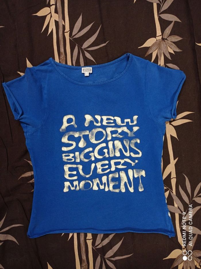 Tee-shirt court, original, couleur bleu électrique avec slogan "A New story biggins every moment" devant et dos. 97% coton 3% elasthane. Marque Etam, taille 38. En très bon état #croptop #croctopetam #croctop38 #etam38 #etam #teeshirtcourt38 #teeshirtcourtetam38 #teeshirtetam38 #bleuélectrique38 #femme38 #hautfemme38 #anewstorybigginseverymoment #teeshirtbleuelectrique38