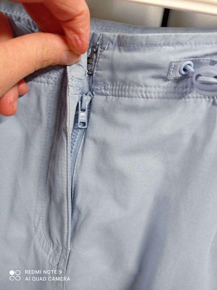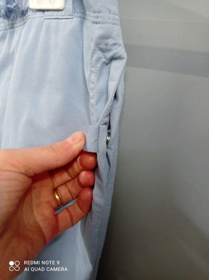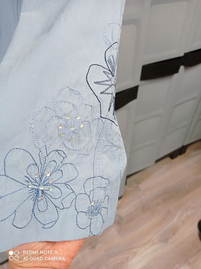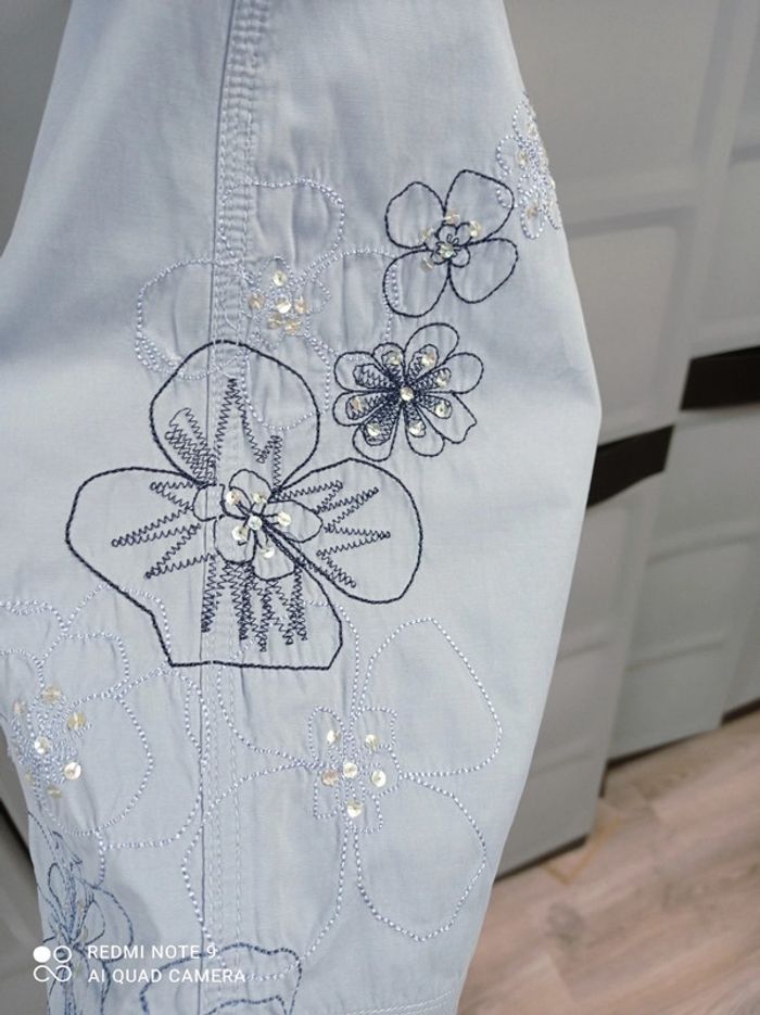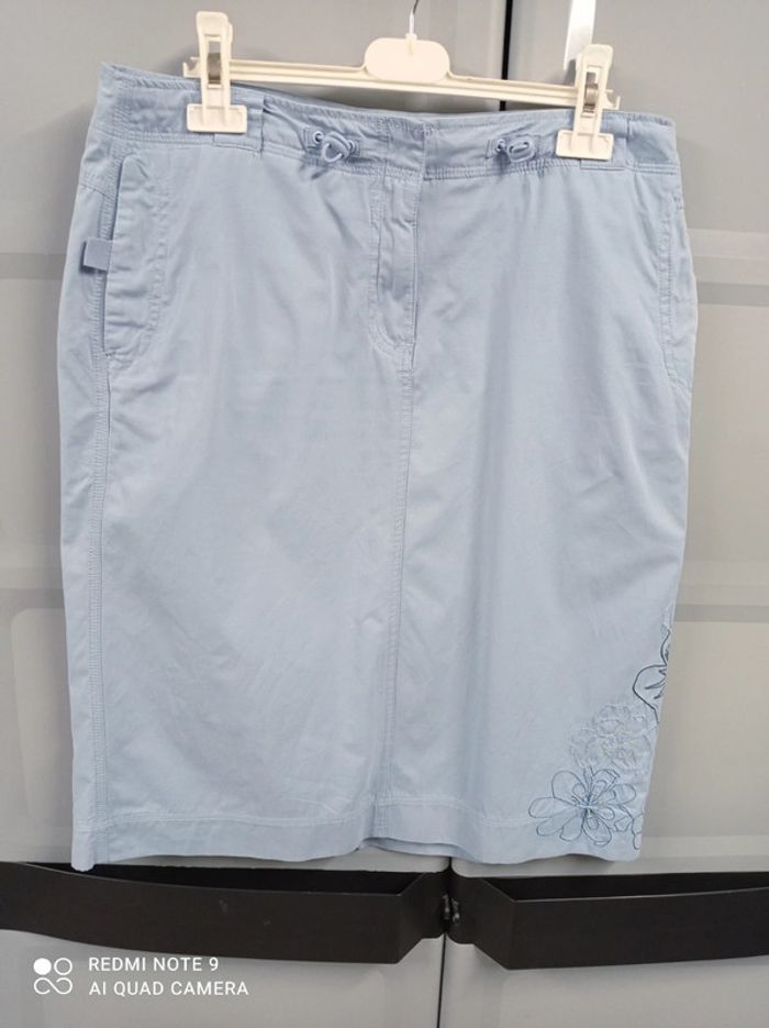 Jolie jupe bleu ciel, fermée par agrafe + fermeture éclair, passants à la taille, 2 poches raglan fermées par pression devant, 1 poche plaquée fermée également par pression à l'arrière. Élastiques+stoppeurs à la taille pour régler le serrage. Jolies fleurs brodées sur le côté gauche qui s'étendent devant et derrière, avec strass cousus. Hauteur jupe 60cm. Marque Mim , taille 40. En excellent état. #mim40 #jupe40 #jupebleuciel40 #jupemim40 #jupebrodee40 #femme40 #femmeete40 #ete40 #40 #basfemme40 #mim