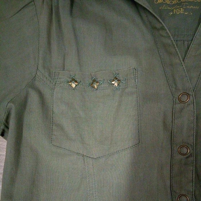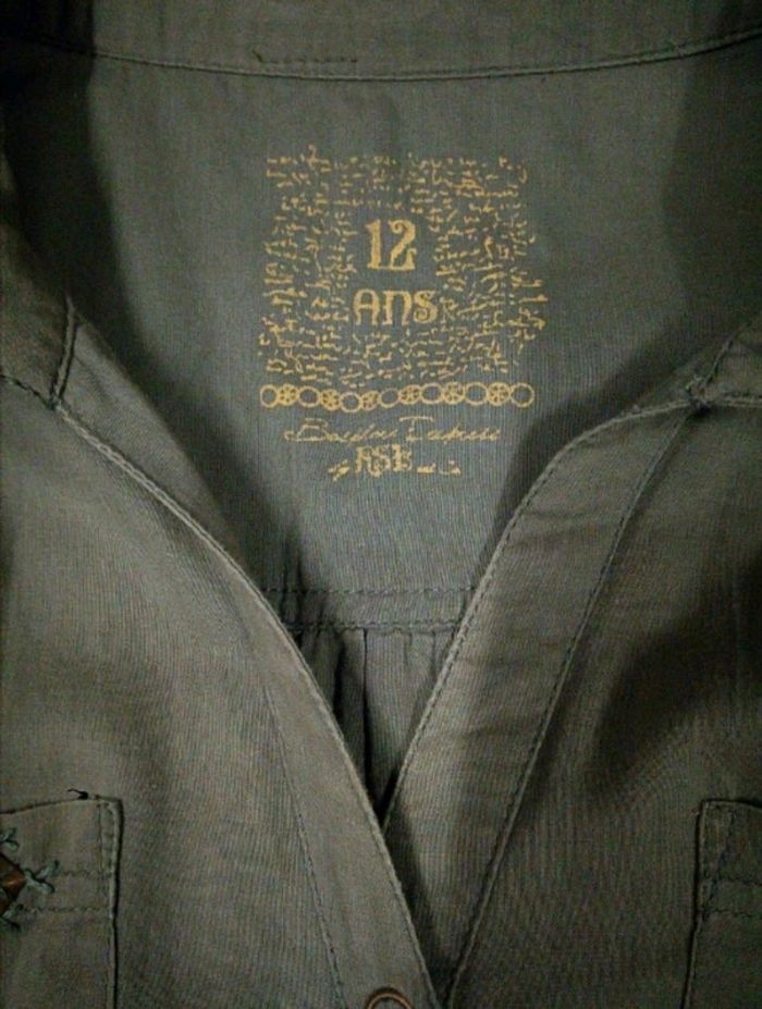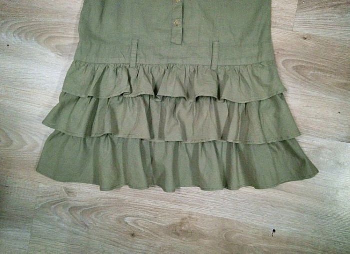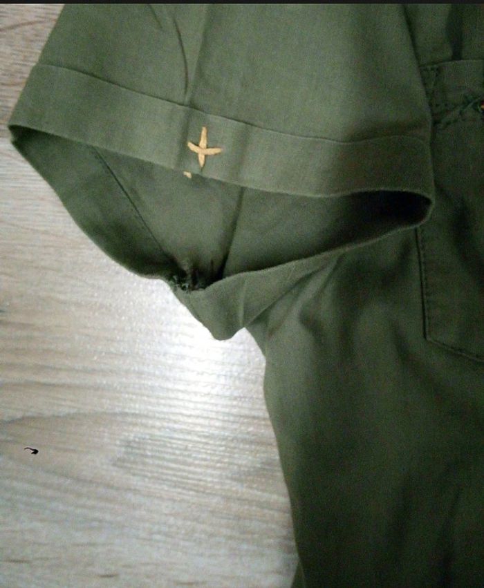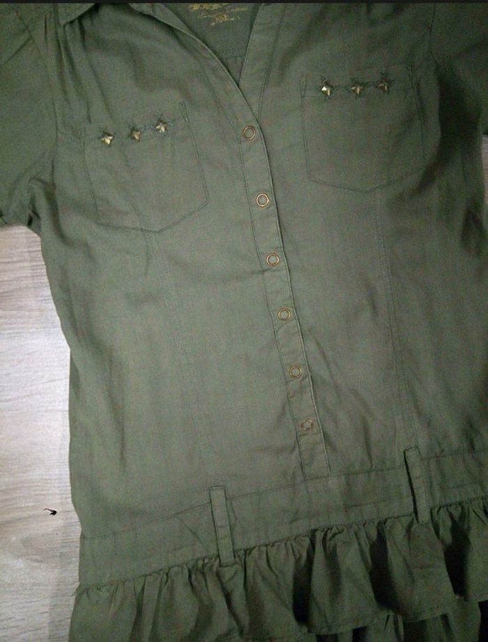 Jolie robe couleur kaki, haut façon saharienne, bas volanté. Nombreux détails : passants pour ceinrure, 2 poches poitrine munies chacune de 3 étoiles cousues, manches courtes avec petit revers et couture jaune en étoile. 100% coton. Marque Gemo, taille 12 ans Comme neuve, portée 3 fois. #saharienne12ans #robe12ans #robekaki12ans #gemo12ans #vetemenrfille12ans #etefille12ans #fille12ans #vetementkaki12ans #robegemo12ans #robeavolants12ans #robesaharienne12ans