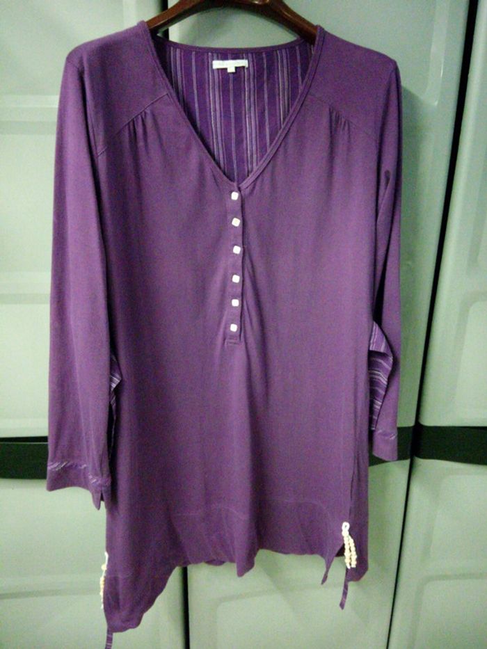Jolie chemise de nuit violette, decoleté profond en V, boutonné avec 6 boutons carrés nacrés, petits plis au départ des épaules devant, manches longues avec liseret rayé au poignet rappelant les liens rayés à nouer à l'arrière pour mettre la taille en valeur. Petites fentes en bas de chaque côté + cortelette avec perles. 100% coton. Marque LINGERIE TEX, taille L (42/44) En bon état : très léger trait de décoloration à l'arrière mais qui ne se voit pas car masqué par le lien noué juste au même niveau. A part cela aucun défaut. #chemisedenuitL #chemisedenuit4244 #chemisedenuittexL #chemisedenuitviolette4244 #chemisedenuitvioletteL #vetementdenuitfemme4244 #vetementdenuitfemmeL #lingerietex #lingerietexL #tuniqueviolette4244 #tuniquevioletteL #vetementfemme4244