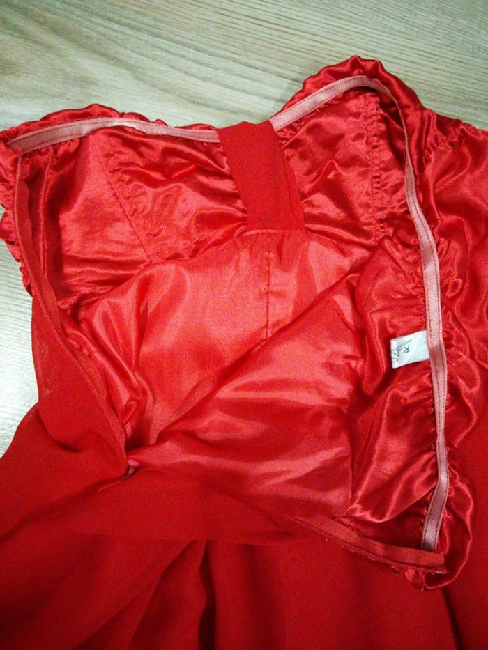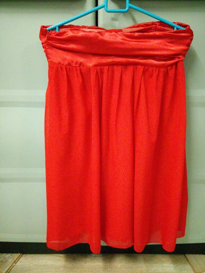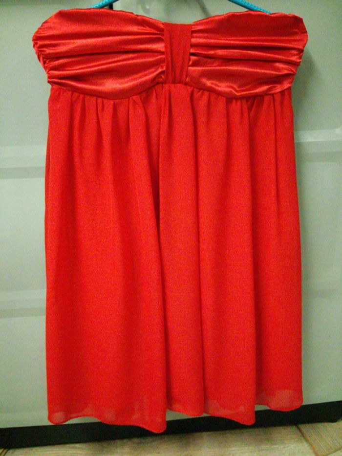 Robe bustier courte rouge, baleines au niveau du bustier satiné, le reste de la robe est en mousseline, robe doublée, fermée par zip sur le côté. Tour de poitrine 84cm (maximum), longueur de la robe 71cm. En bon état, portée 3 fois. #robebustier36 #robebustierrouge36 #rjstory36 #robebustierrjstiryrouge36 #robe36 #robefemme36 #robeado36 #robesoiree36 #robesoireerouge36 #robenoel36 #vetementfemme36