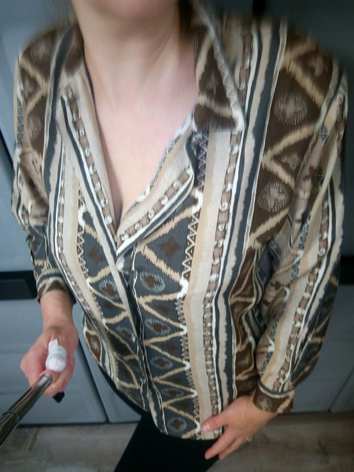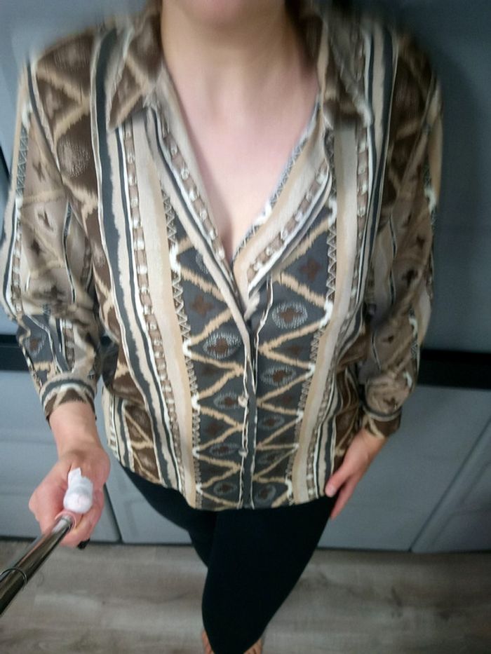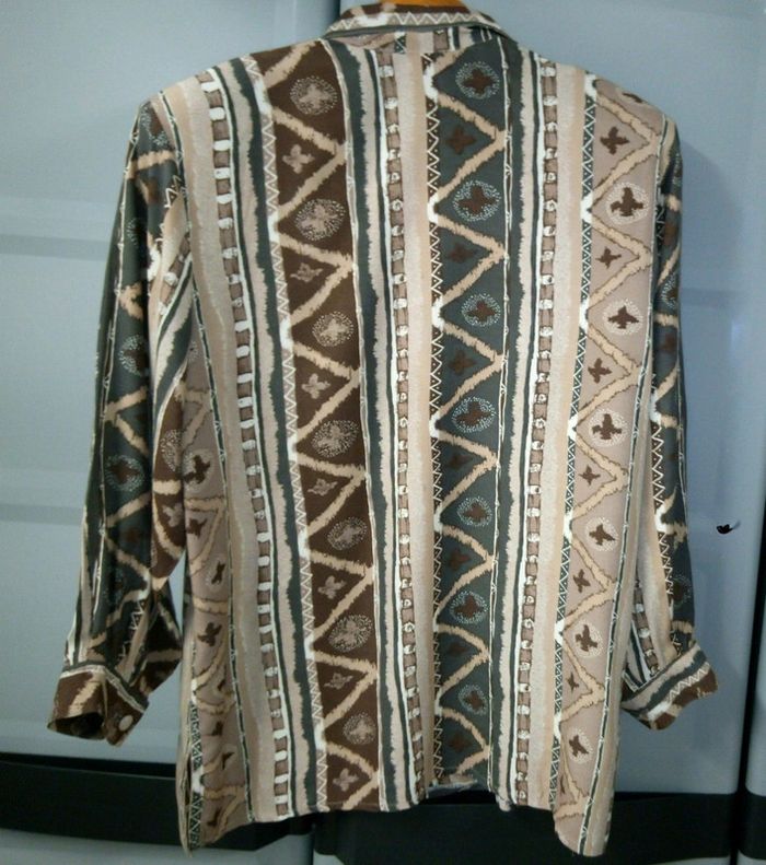 Chemisier vintage, imprimé tons marron/beige, boutons recouverts. Taille 40/42. Très bon état. #chemisefemmevintage40 #chemisefemmevintage42 #chemisiervintage4042 #hautfemme4042 #vetementvintagefemme4042 #chemisiermarron40 #chemisiermarron42 #blousemarron4042