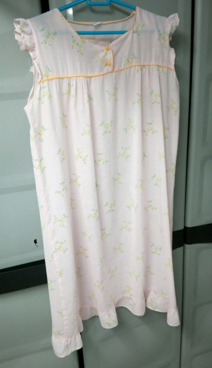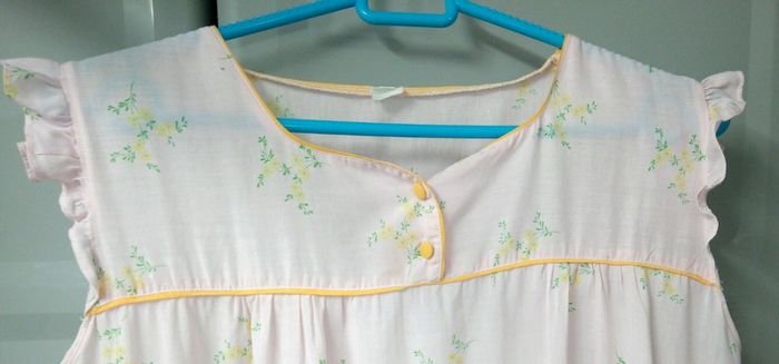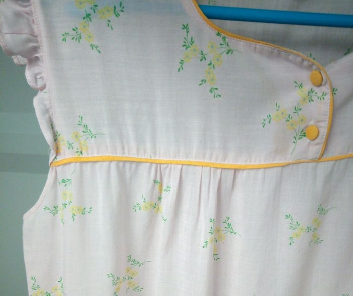 Chemise de nuit vintage, rose pâle avec liseret et 2 boutons jaunes, motifs petites fleurs jaunes avec son feuillage. Volants aux emmanchures et un volant en bas de la chemise de nuit. Taille 34/36 (14-16ans) En bon état #chemisedenuitété #chemisedenuitvintage36 #chemisedenuit3436 #chemisedenuit14-16ans #tenuedenuit36 #femme36 #fille14ans #fille16ans