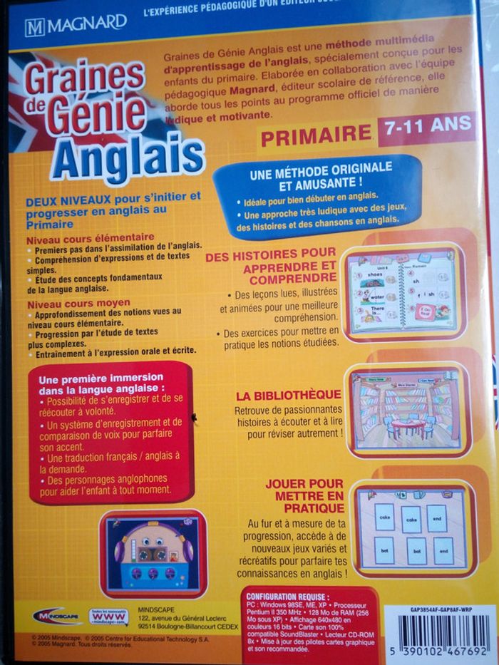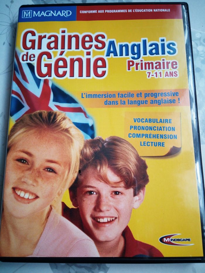 Jeu PC éducatif "Graines de Génie Anglais", pour apprendre l'anglais en s'amusant (vocabulaire, prononciation, compréhension, lecture). Pour les enfants du Primaire (de 7 à 11 ans). Marque Mindscape en partenariat avec Magnard. En très bon état, manuel d'utilisation + 2 CD-ROM (sans rayure).