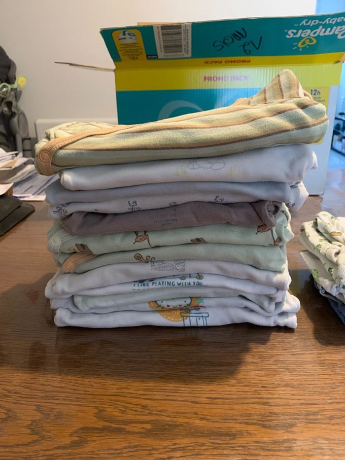 Bon état, pas de taches ni de trous. 12 bodies manches longues et 5 bodies manches courtes. Taille 12 mois.