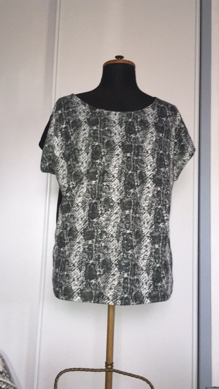 teeshirt manches courtes avec motifs effet peau de serpent et des petits sequins transparents qui rajoutent du charme à ce tee-shirts très peu porté le dos du teeshirt est de couleur noir stylé vintage #clemajosXL