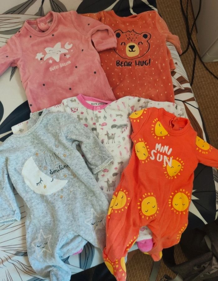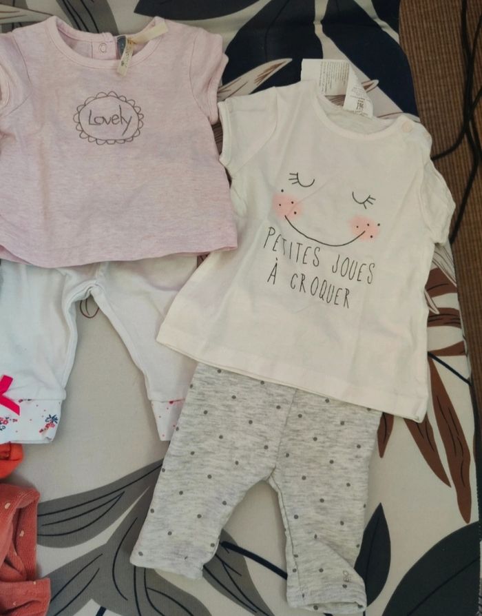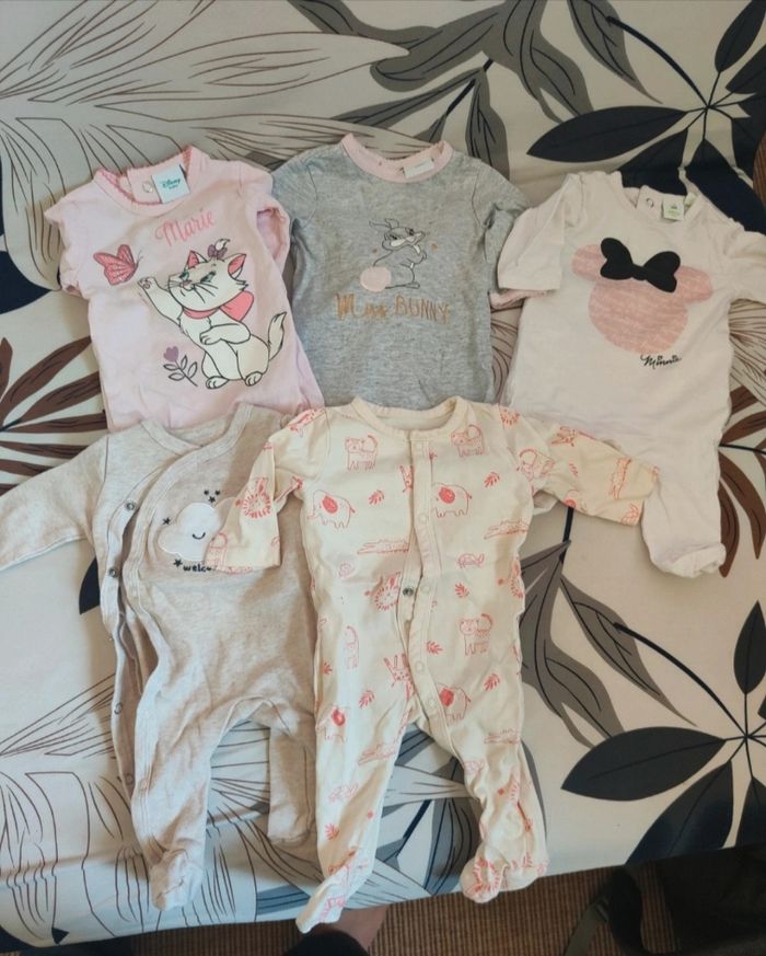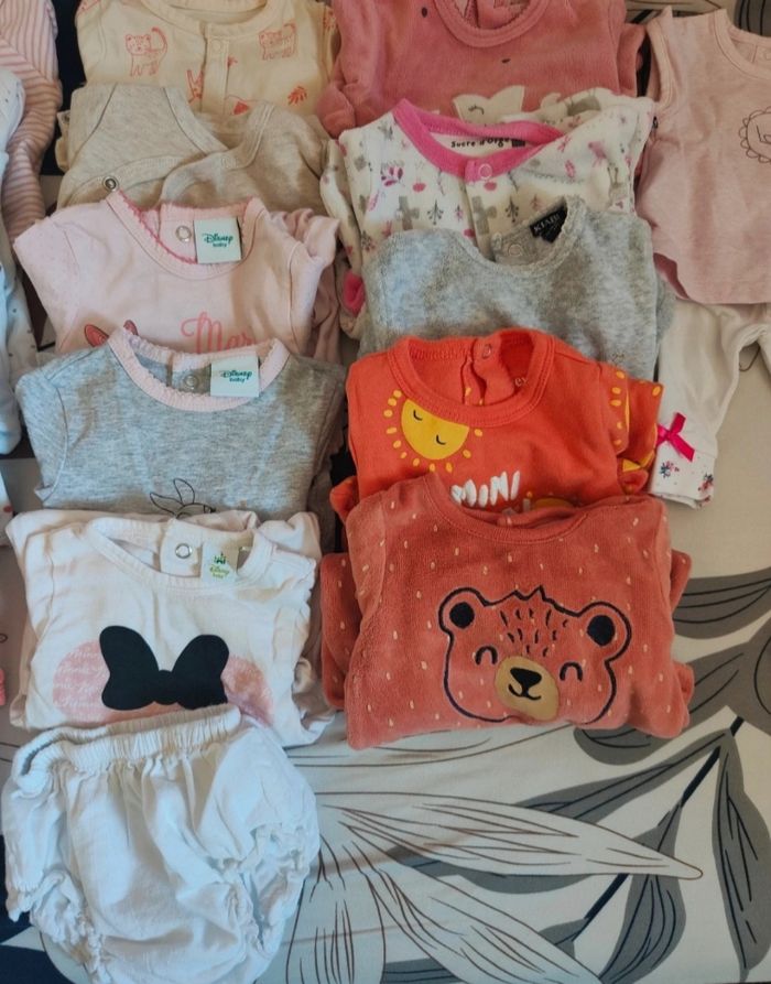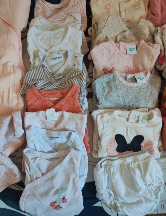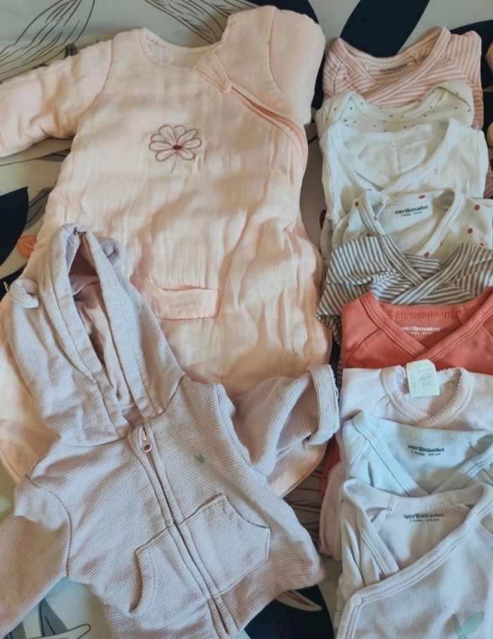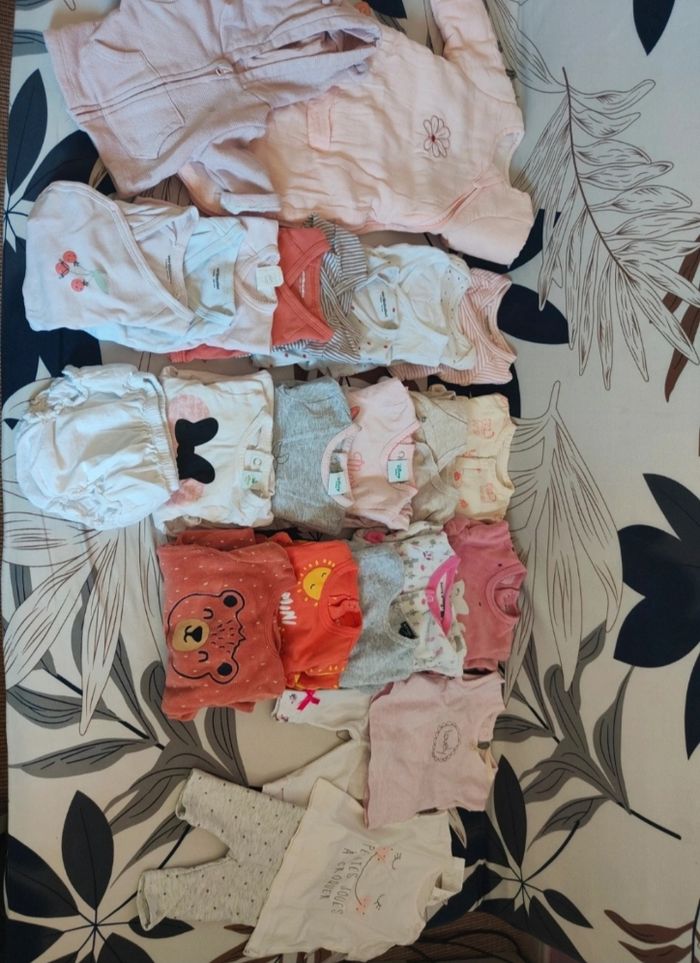 Lot de 22 vêtements En parfait état, voir certains neufs Lot de body ML, pyjama, gigoteuse avec manches.. Taille 1 mois Diverses marques