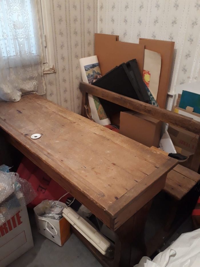 Bureau ancien en bois. Banc et table d'un seul tenant. Encrier