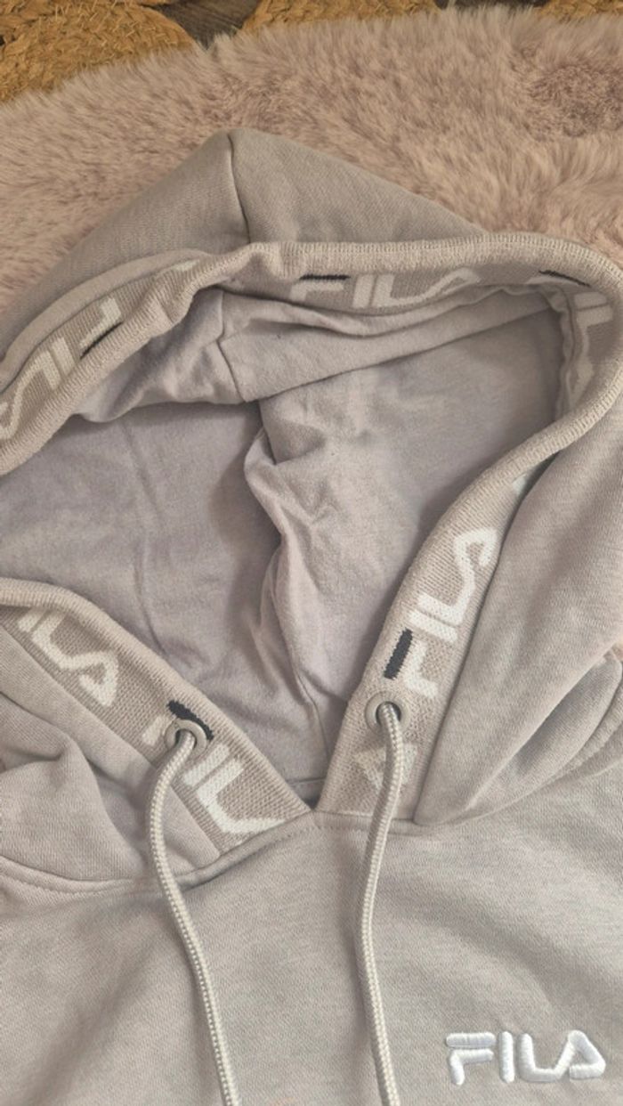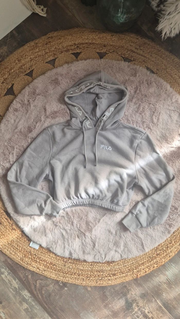 Sweat à capuche court et à manches longues gris clair. Resserré a la taille. Confortable et stylé. Convient pour le sport et l'eps mais également pour la vie de tout les jours. Vraiment sympa porté. Taille XXS de chez Fila.