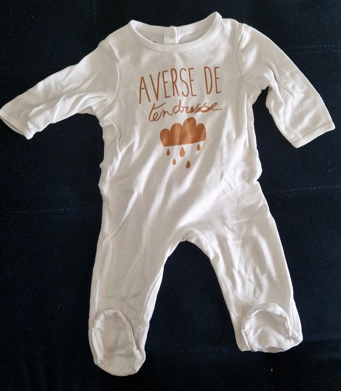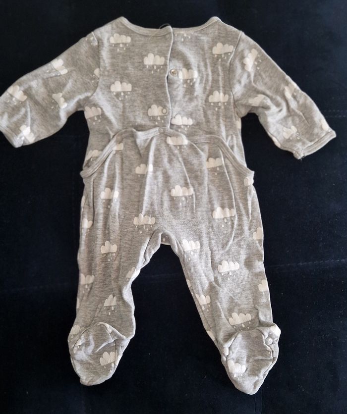 2 pyjamas avec ouverture sur le dos (modèle nuages) et un avec les boutons devant sur le côté. Ils sont en très bon état