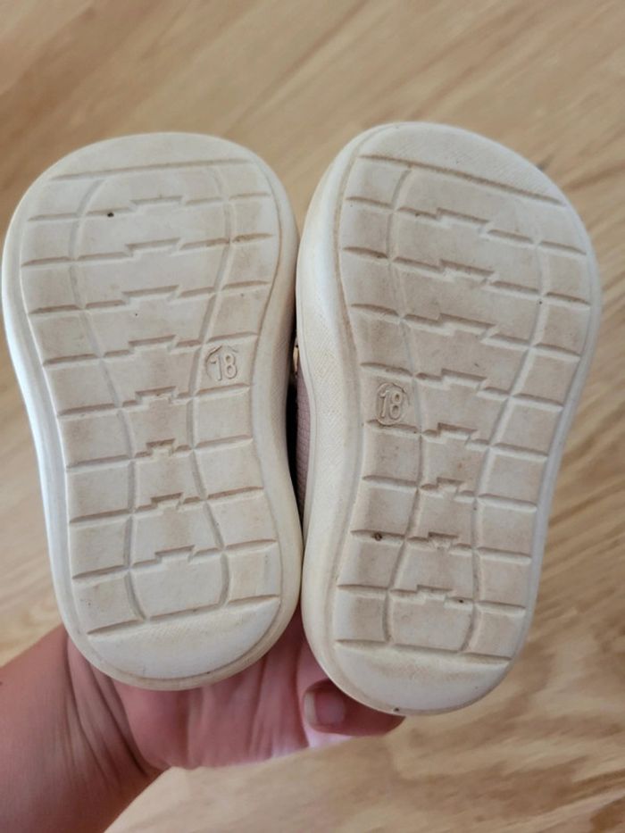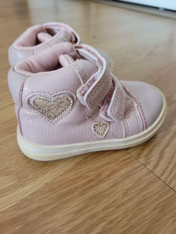 Basket freemouss taille 18 Rose à paillette La semelle est legerement jaunie , 1 impact visible sur le pied gauche.