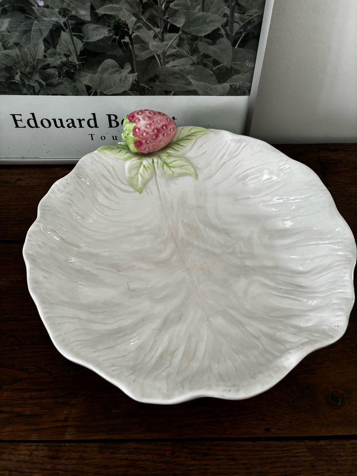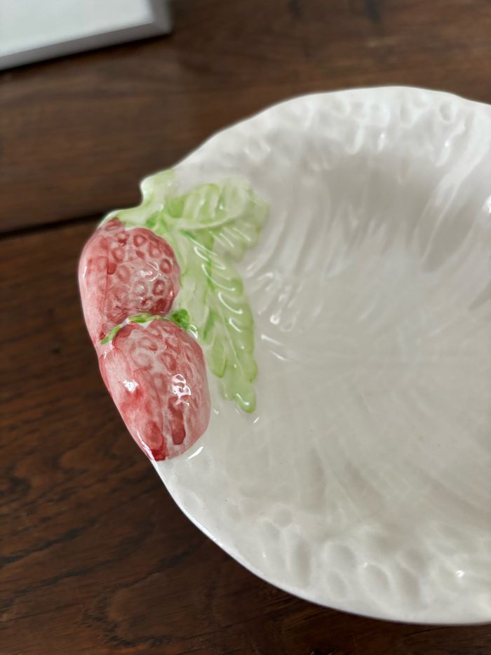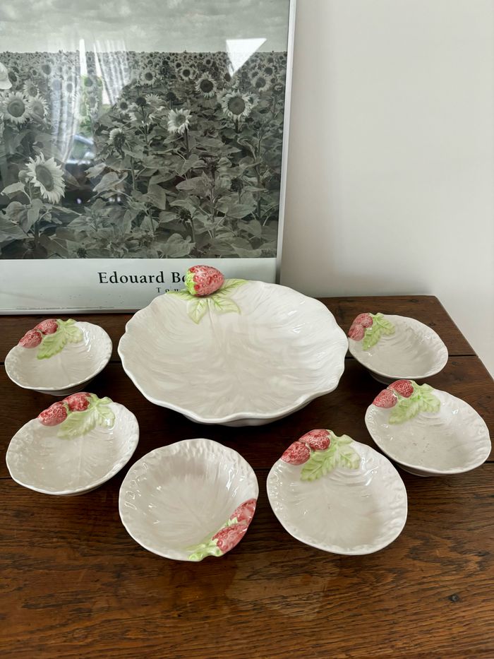 Vintage grand plat creux et 6 coupelles barbotine fraises - photo numéro 1