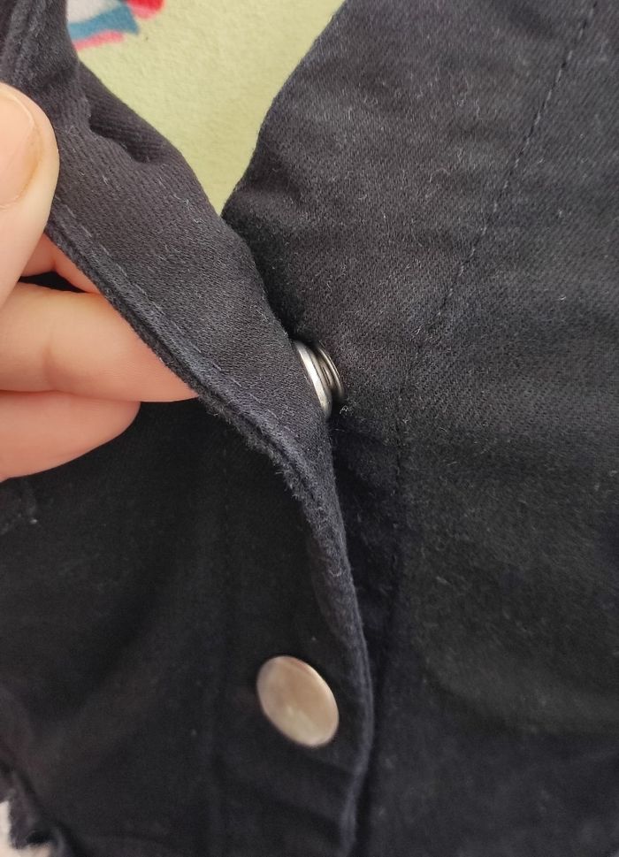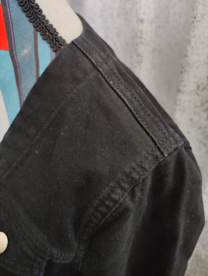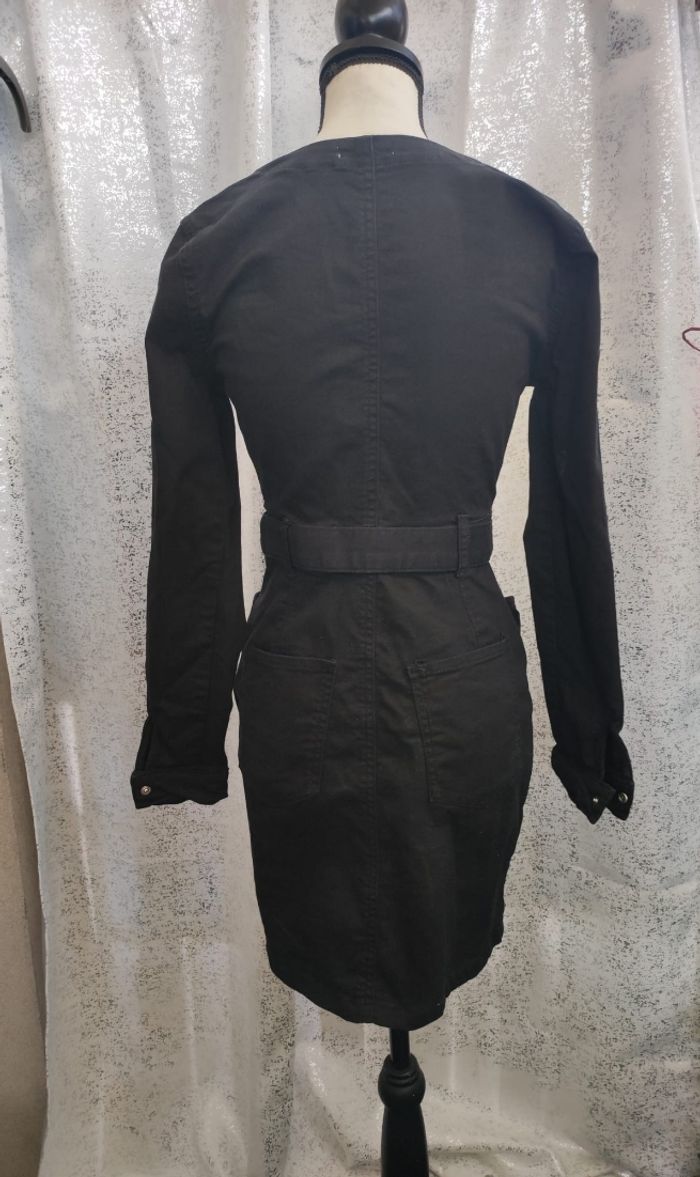 Robe en jean noire ( matière à éviter de rentrer en contact avec un vêtement a poil) j'ai beau passer le rouleaux sur certains endroits ça ne sors pas, un tâche sous le bras droit. De chez tally weijl en taille 32. Boutons a pressions et ceinture a la taille, deux poches a la poitrine ainsi que sur le côté et a l'arrière.