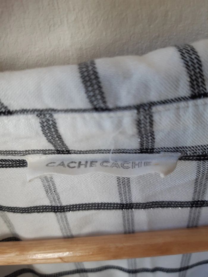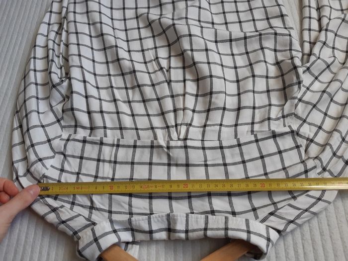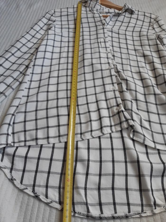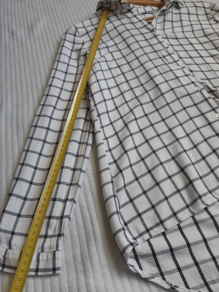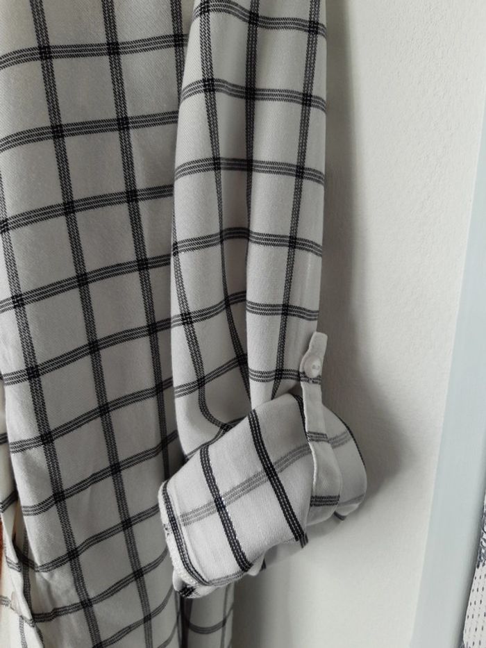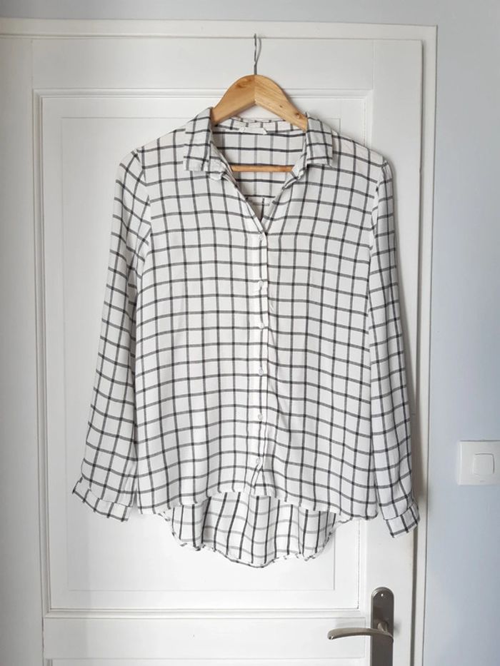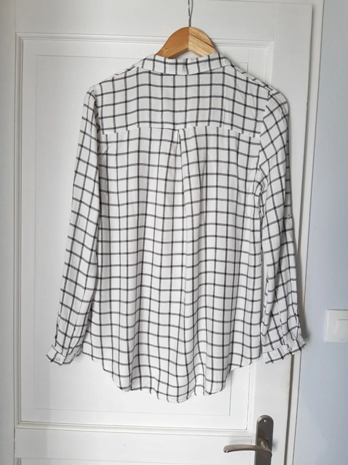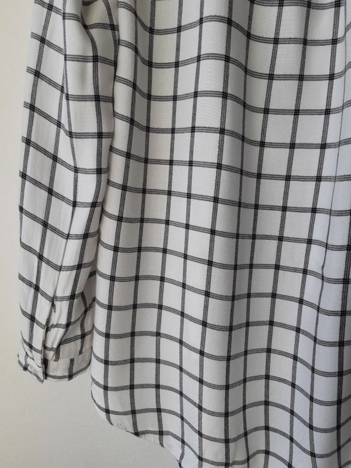 Chemise fine et légère À motif carreaux Manches longues retroussables Blanc, noir et argenté Un peu plus longue à l'arrière qu'à l'avant Etiquettes de matière et taille coupées mais correspond à un S/36 #anthonyagnes_femme36