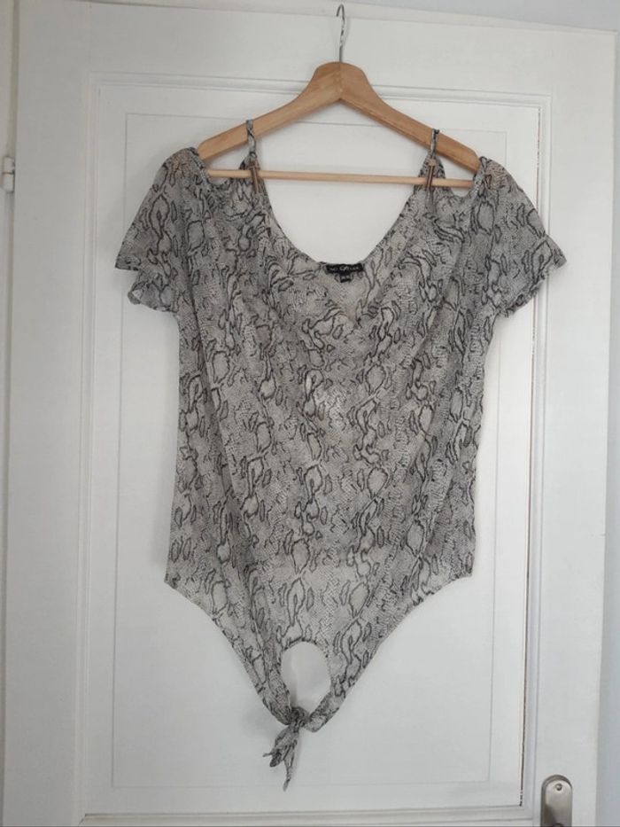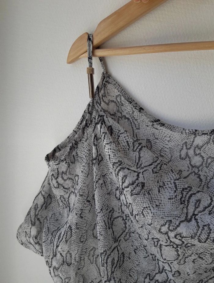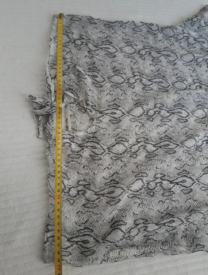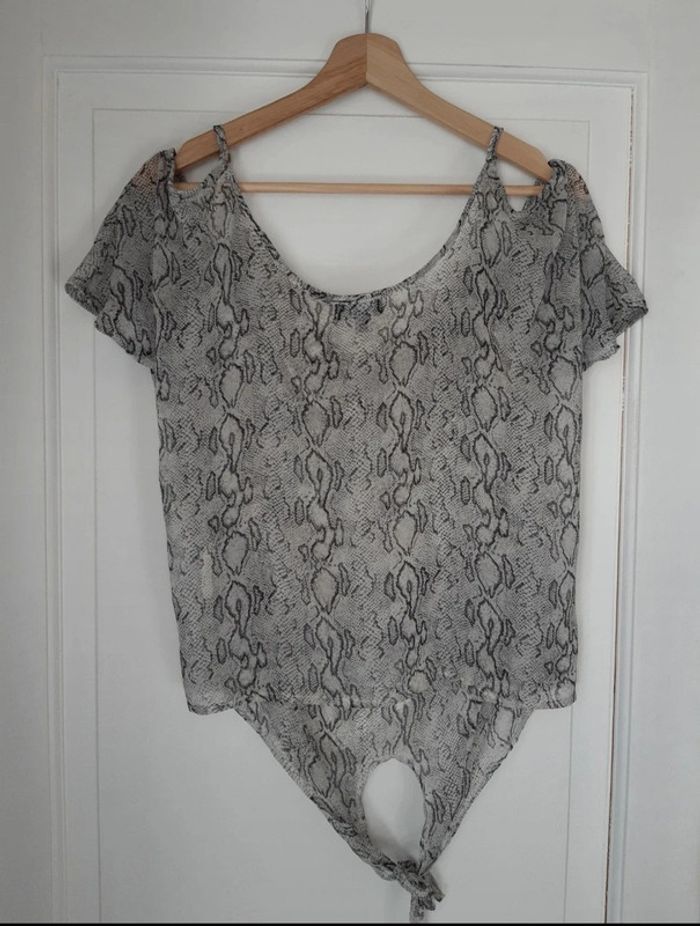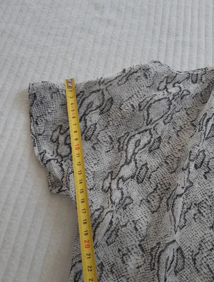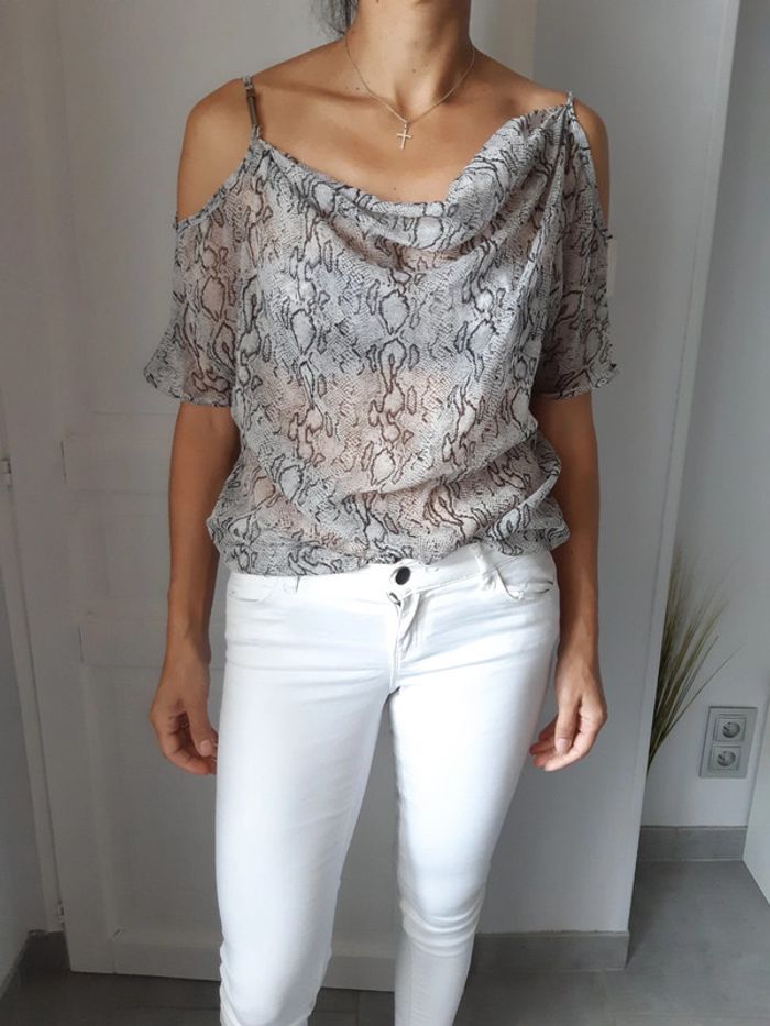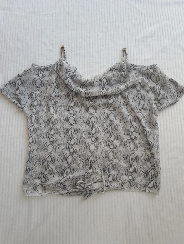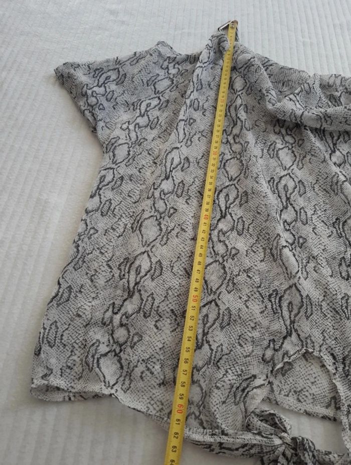 Blouse transparente fine et légère Manches courtes Col drapé/ bénitier Motif python serpent Nœud à nouer sur le devant Épaules dénudées/découvertes L'étiquette indique une taille 34/36, correspond davantage au S/36 #anthonyagnes_femme36