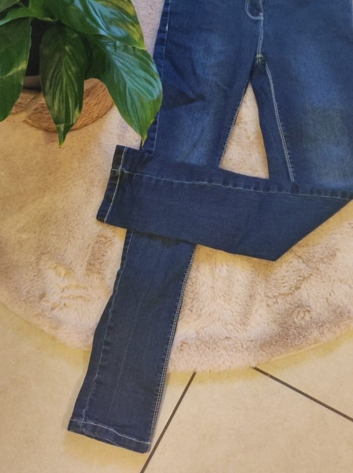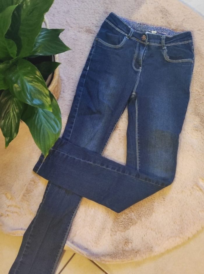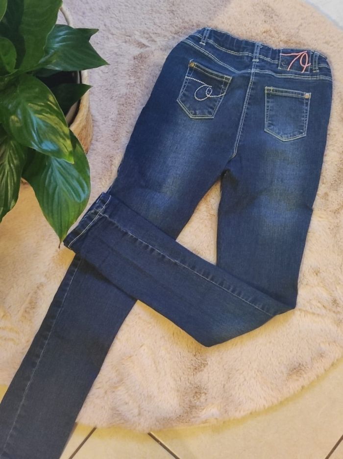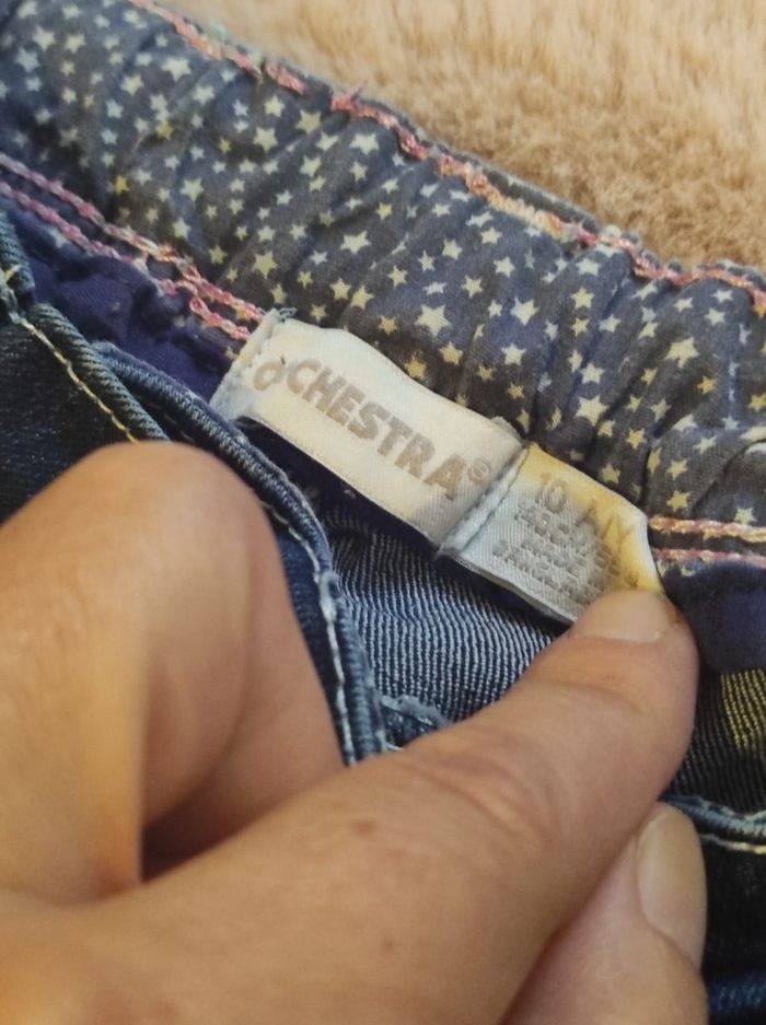 Jeans slim de chez Orchestra (10ans). Fermeture éclair et bouton avec élastique sur le côté pour ajuster le jeans à la taille de l'enfant.