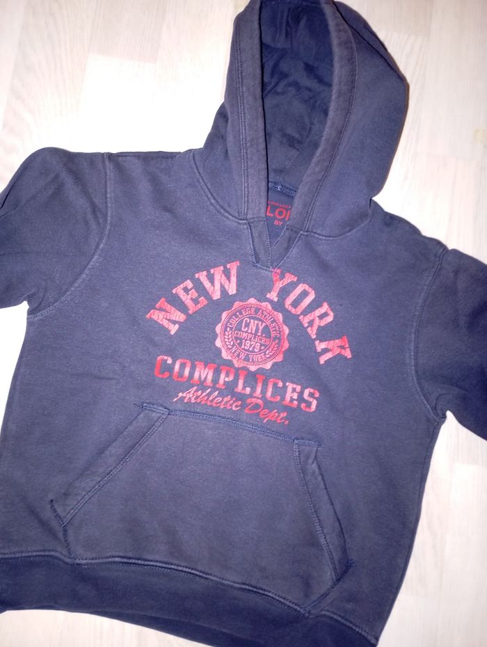 Sweatshirt gris anthracite foncé À capuche, poche ventrale et sérigraphie rouge Marque : Complices T. 6 ans Très bon état général