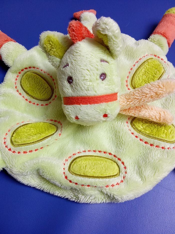 Doudou mixte rond motif girafe prédominance pour du vert anis, pas d'étiquette de marque ou autre. Bon etat général Beaucoup d'autres doudou enfant également à vendre ds mon dressing et réduction activée