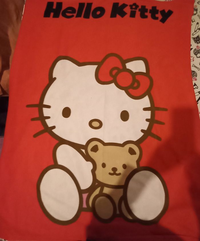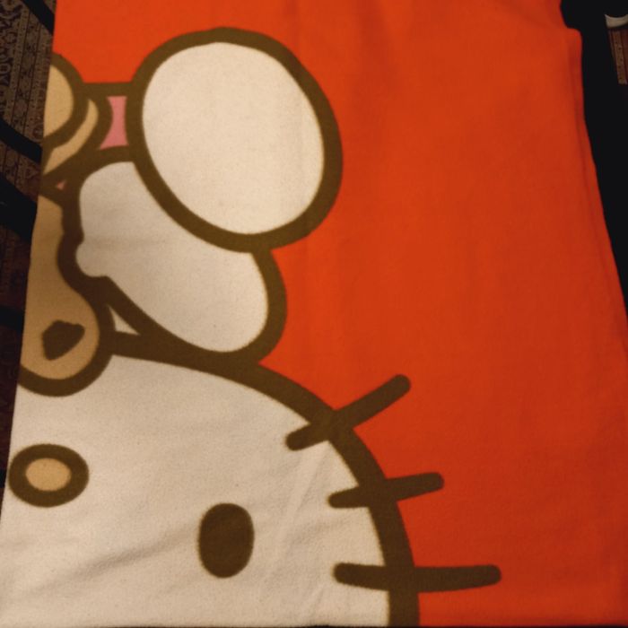 Couverture polaire pour enfant en bon état, couleur rouge et blanc, hello kitty, taille : 160×125 cm.