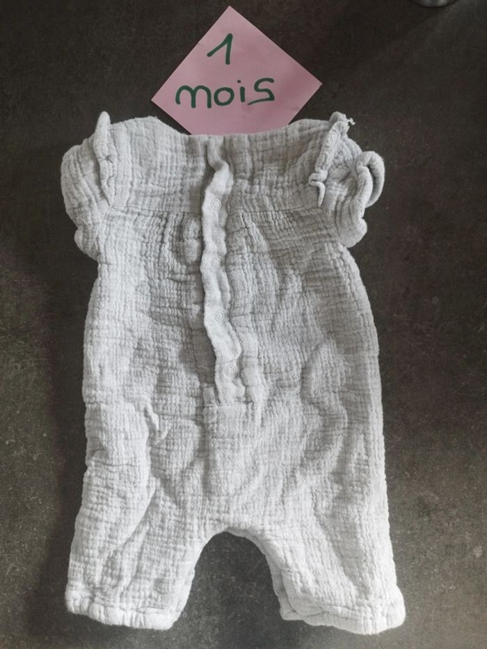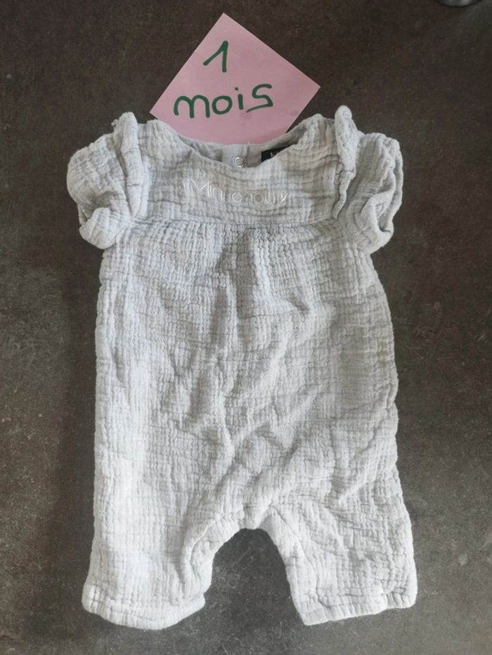 Combinaison grise en gaze de coton, plutôt épaisse avec inscription "mini choux" Très bon état, Taille 1 mois #vetementbebefille1moisjustine182129