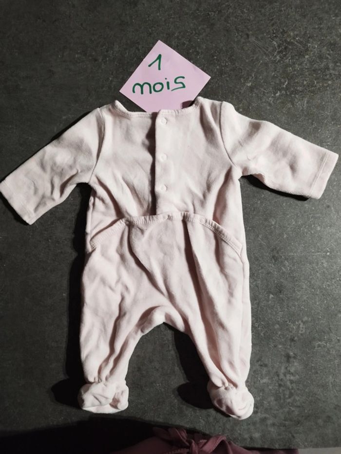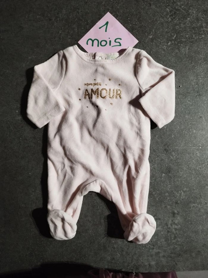 Pyjama en velours rose clair avec inscription "mon petit amour" à paillettes dorées. Très bon état, peu porté ! Taille 1 mois #vetementbebefille1moisjustine182129