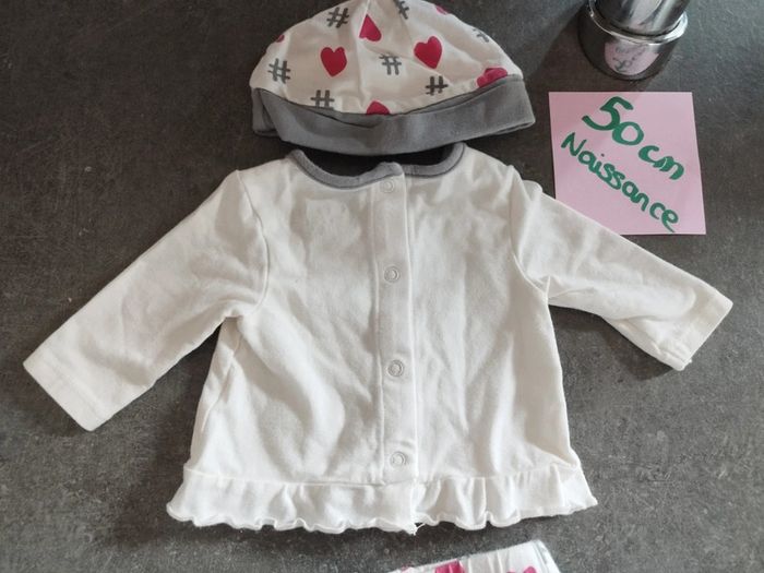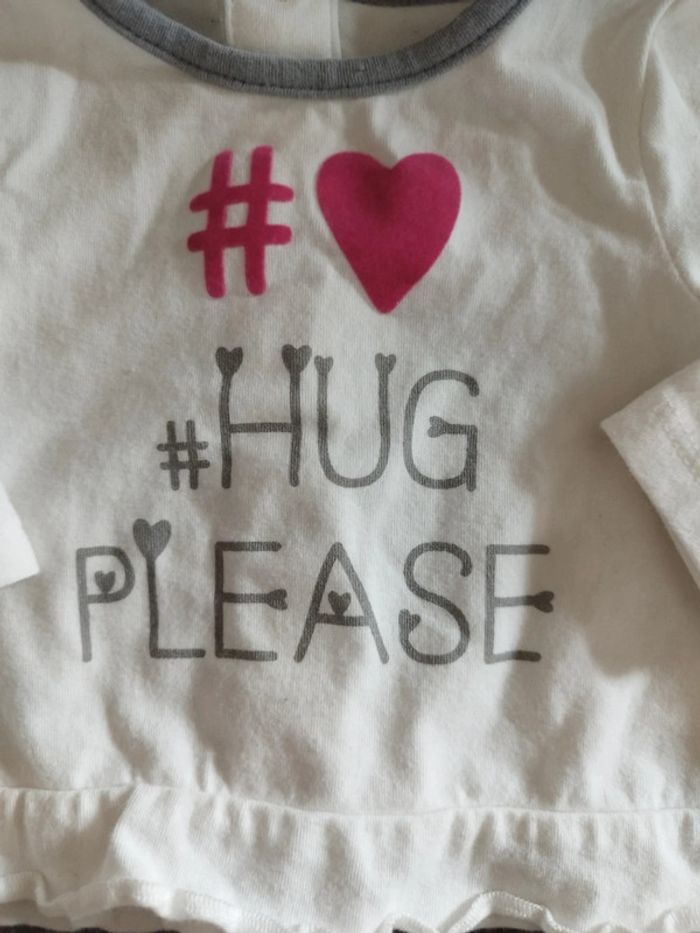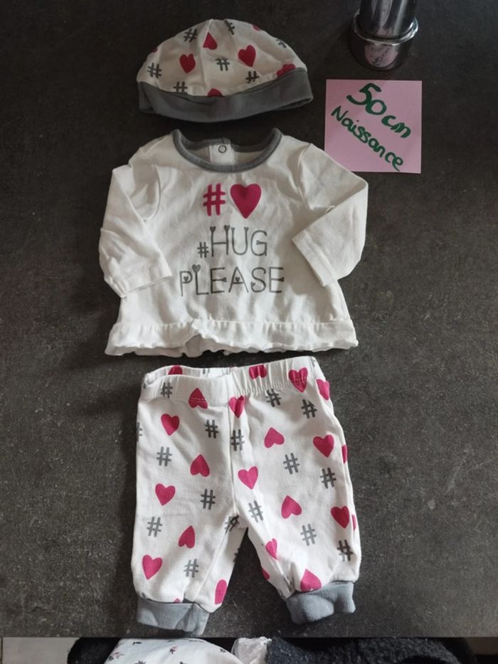 Ensemble 3 pièces composé : 1 haut manches longues avec inscription "#hug please" 1 pantalon avec des # et des coeurs 1 bonnet assorti. EXCELLENT état, porté une ou 2 fois ! #vetementbebefille0moisjustine182129 #vetementbebefille50cmjustine182129