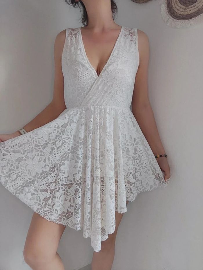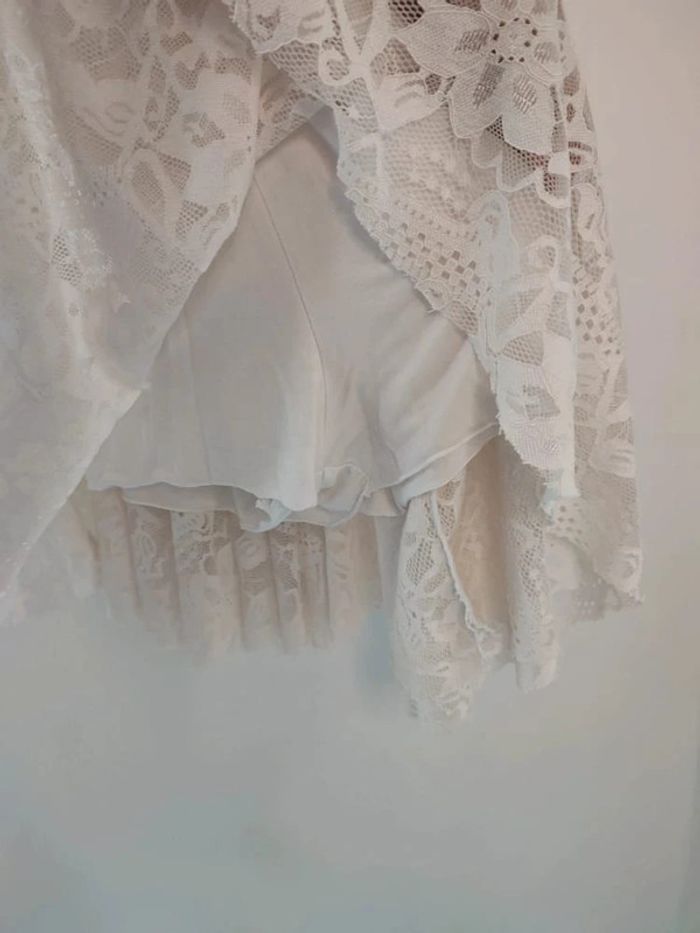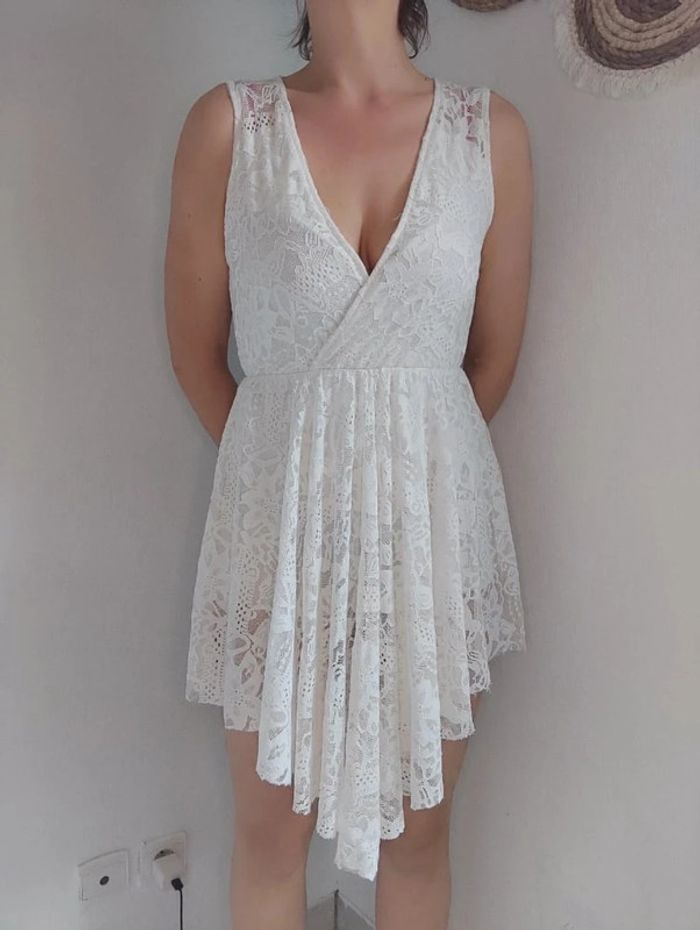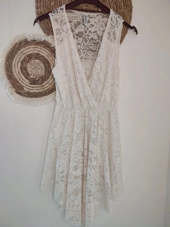 Jolie petite robe blanc/beige a dentelle avec shorty blanc intégré. Devant en pointe. Longueur total devant: 90cm Longueur arrière :78cm 👗Marque : New Collection 👗Taille : 1 donc 36-38 #modelia8636 #modelia8638 #dentelle #été #printemps #newcollection