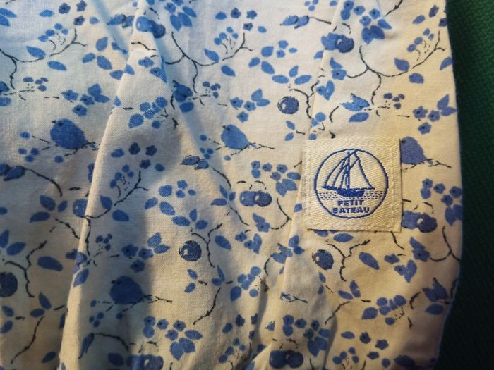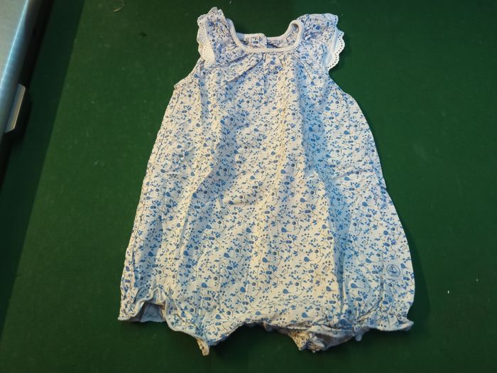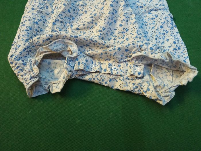 Robe Body 1 ans / 74 cm en coton sans manches dentelle Dessin fleurs bleues Ouverture par boutons pression entre les jambes et dans le dos Prix sur les lots (voir nos autres annonces)