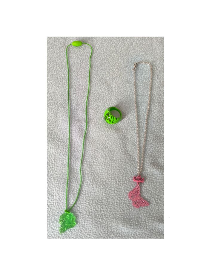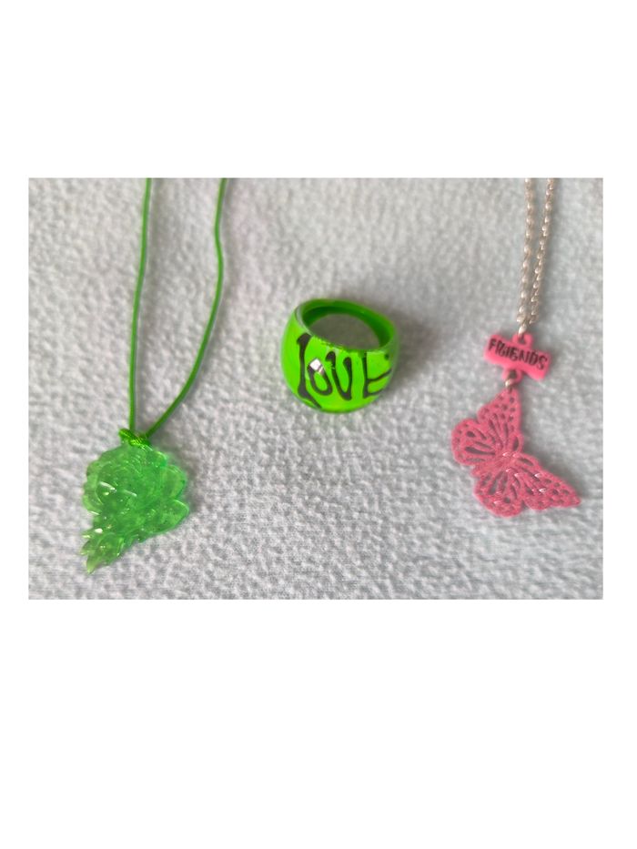 Lot de bijoux enfant. - 1 cordon vert et pendentif fleur verte. Fermoir emboîté. Tour total de 58 cm et longueur de 29,5 cm. - 1 chaînette et papillon rose. Tour total de 38 cm et longueur de 23,5 cm. - 1 bague verte avec écriture noire « love » diamètre 1,9 cm et tour de 4,9 cm. En bon état. Sans marque. 1€ les 3 bijoux. #vero38110enfantsdivers