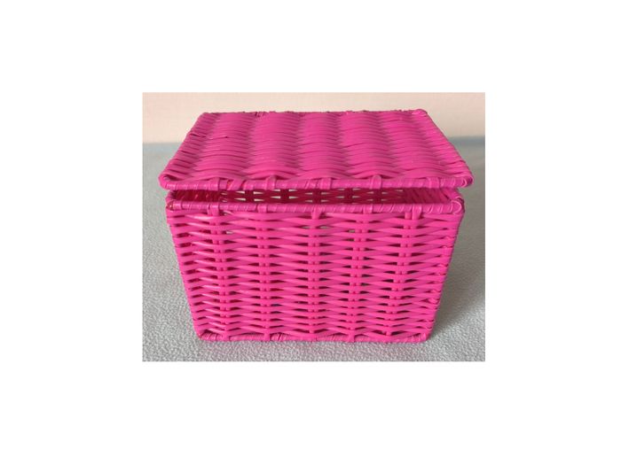 Boîte à bijoux. Boîte à bijoux en cordons plastique rose. Ossature rigide. Longueur : 16,2 cm Largeur : 12,3 cm Hauteur : 11,5 cm En bon état. Sans marque. 3,00€. #vero38110enfantsdivers