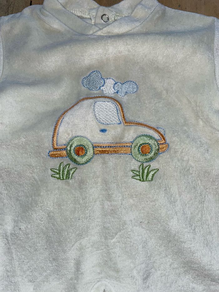 Pyjama velours jaune très pâle motif voiture Taille 6 mois Sans étiquettes de taille et instructions de lavage