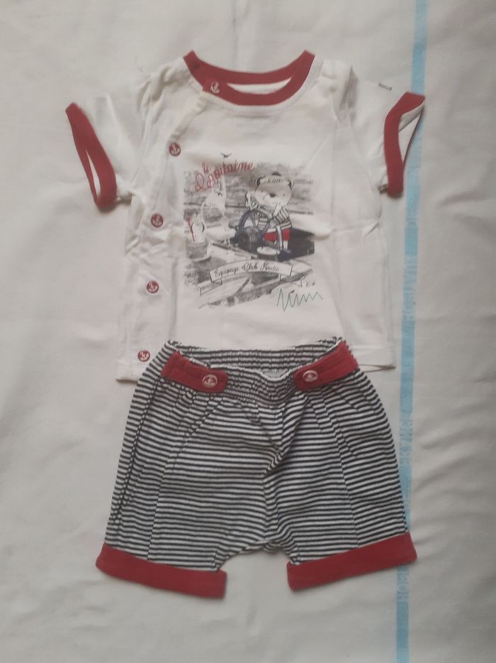Ensemble tee shirt blanc motif ourson marin et short rayé marine 3 mois