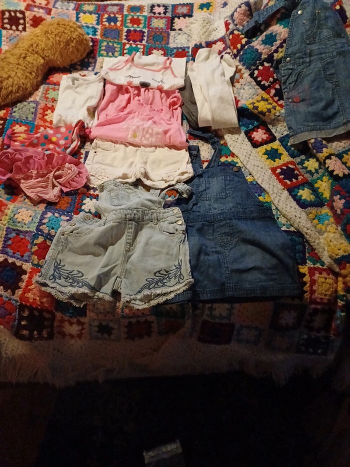 Vend un lot 11 affaires de petite fille 1 short Cobishort 1 débardeur Salopette short 1 Tee-shirt 2 culotte 2 collant laine23/26 et 27/30 1 salopette jupe Et donne une salopette jupe manque les attache Age de 18 à 6 ans