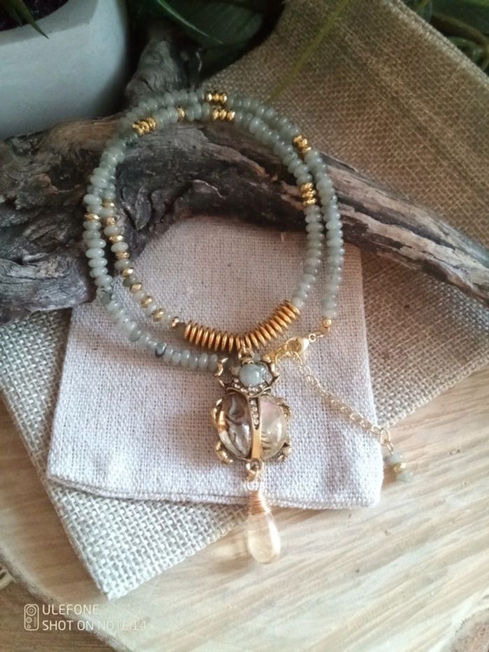 Collier pendentif scarabée ormeaux et pierres de labradorite - photo numéro 2