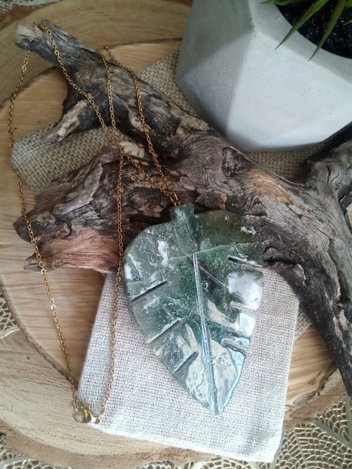 Collier pendentif feuille en pierre naturelle d'agate arbre - photo numéro 1