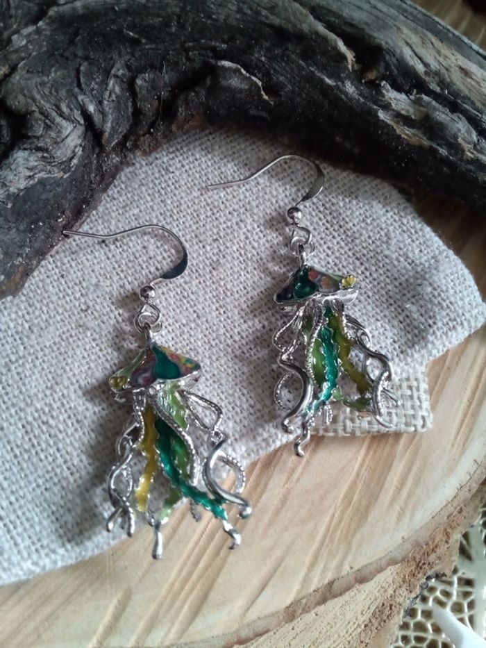 Boucles d'oreilles bohèmes méduses argentées et vertes - photo numéro 1
