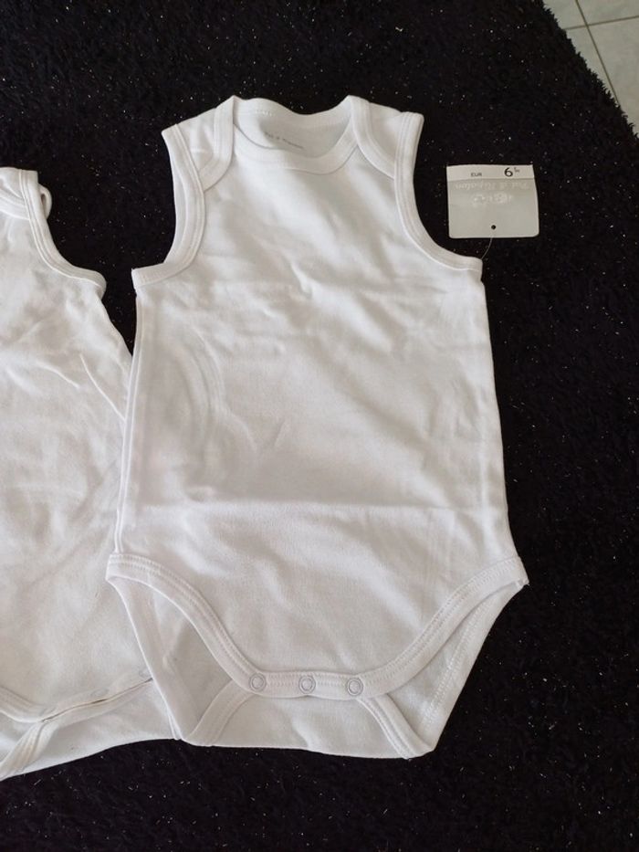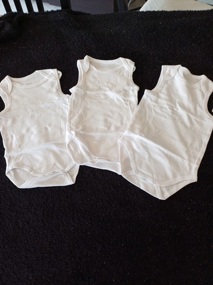 3 bodies blanc sans manches 12 mois dont un tout neuf avec étiquettes