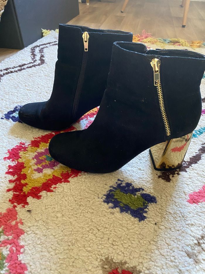 Bottines simili daim noires, talons dorés. Bon état.