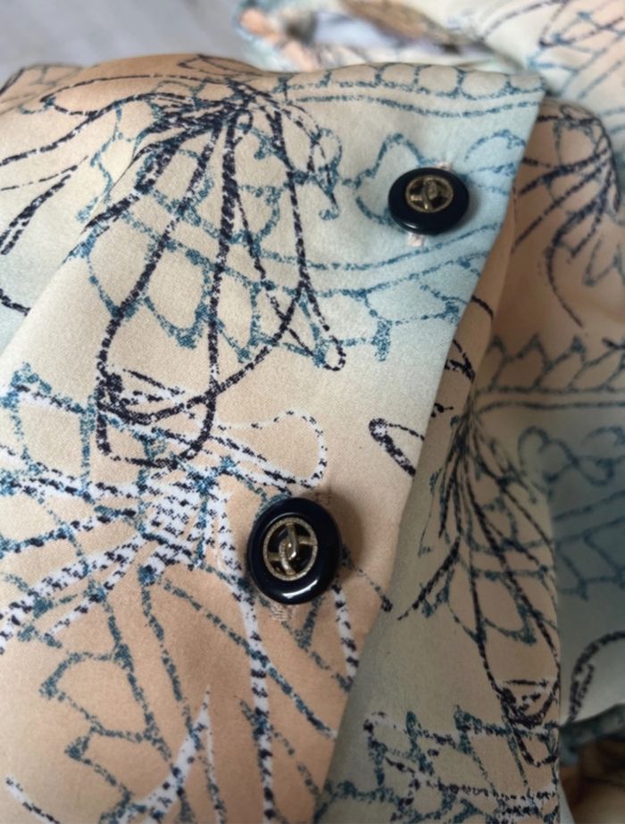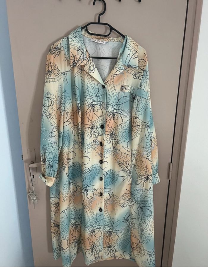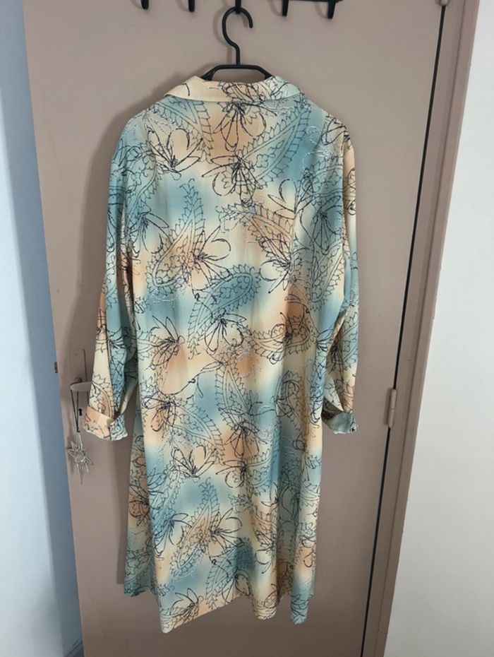 Bonjour ✨ Je vends une chemise à motifs 100% polyester, que je portais en tant que robe longue. Elle n’a été mise qu’une seule fois. Pour plus d’informations, n’hésitez pas à me contacter 😊