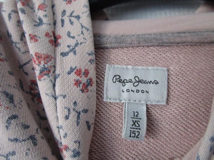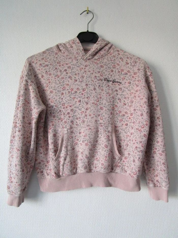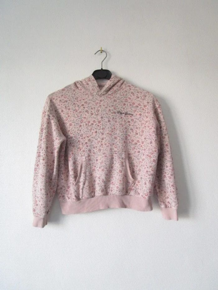 Sweat fleuri Pepe Jeans 12 ans Sweat à capuche de marque Pepe Jeans taille 12 ans Rose pâle, imprimé fleuri Assez court style croc top Poche kangourou 88% coton/12% polyester Quelques traces d'usures au niveau des poignets (cf photos) sinon en très bon état #mamanbrade59fille12ans