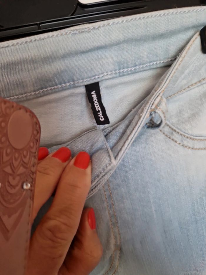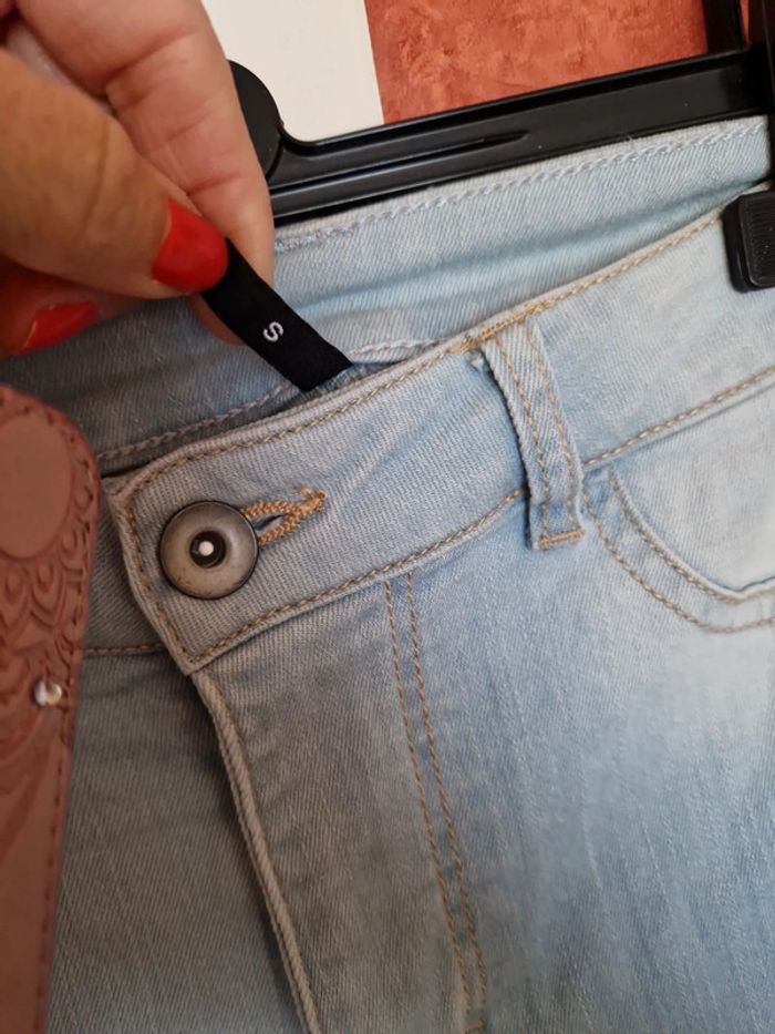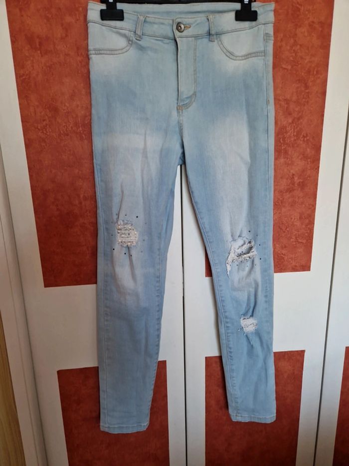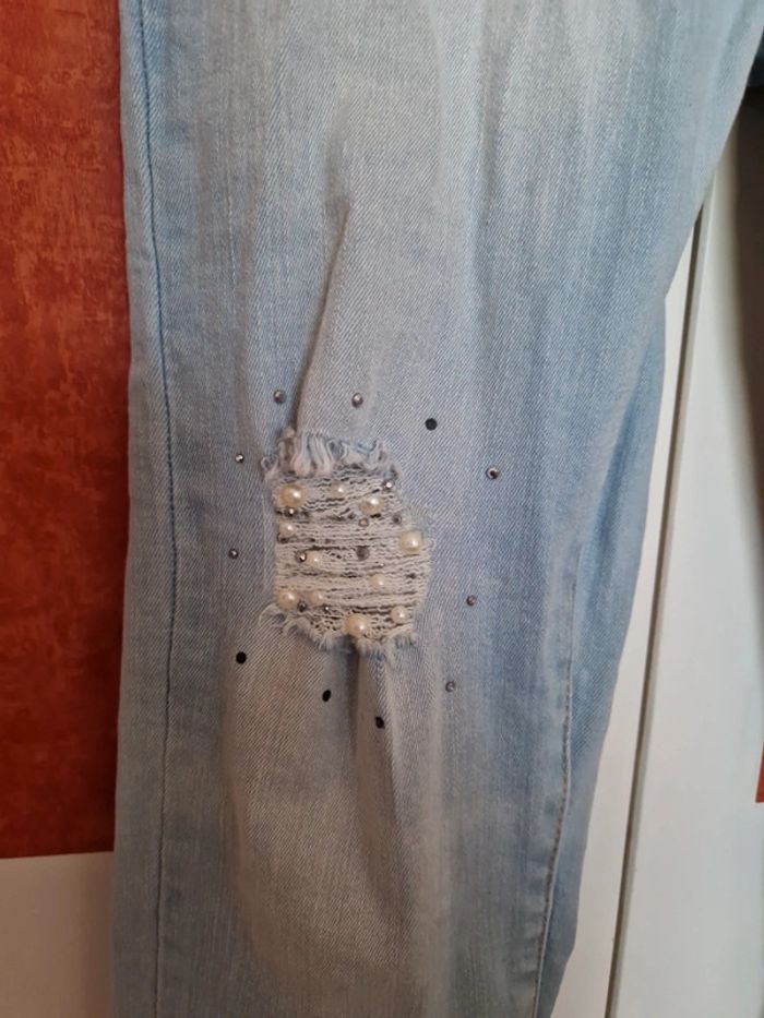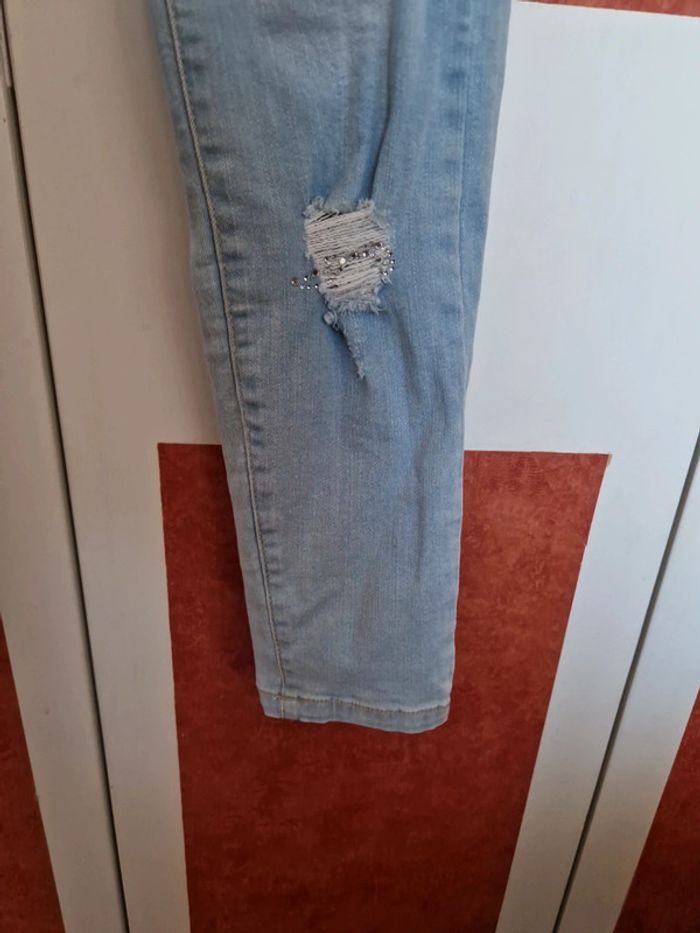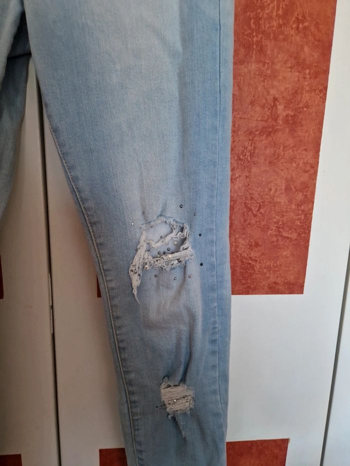 Jean déchiré avec strass et patch sous les déchirure. Matière assez élastique.