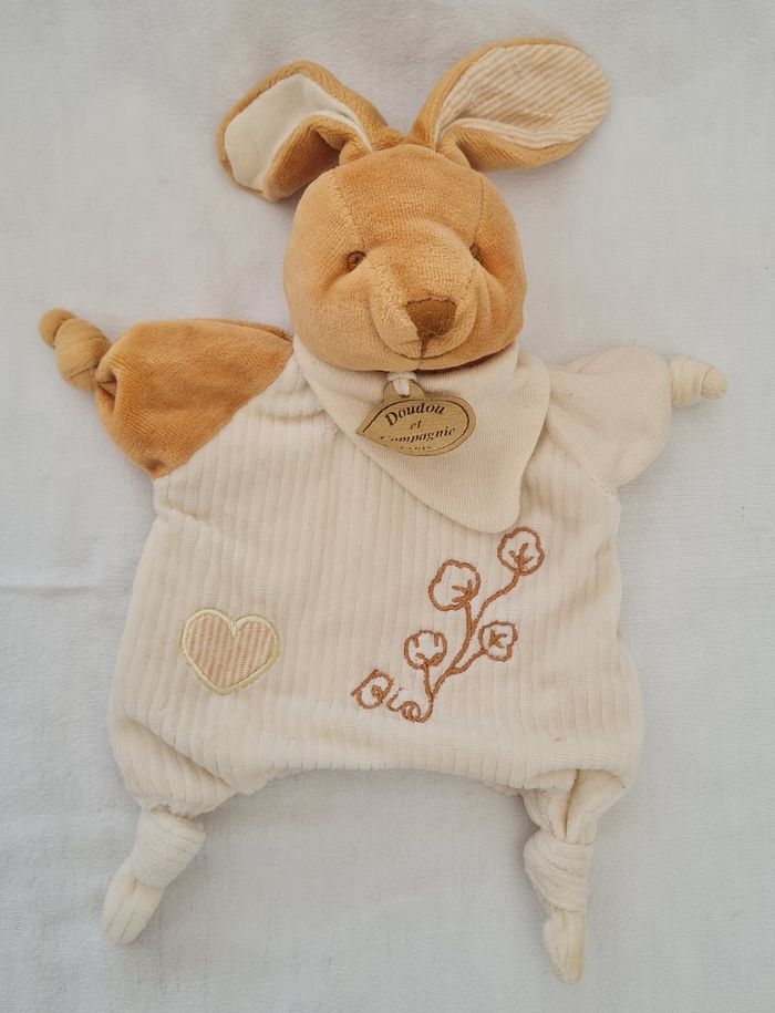 Doudou et compagnie marionnette Lapin bio blanc et beige -Coeur et Fleur de coton