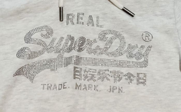 Sweat à capuche Superdry, gris chiné clair avec strass en taille S neuf avec étiquette. Intérieur molleton très doux, sweat chaud. D'autres vêtements de marque dans mon dressing