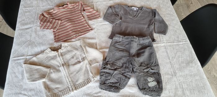 Vend lot 4 pièces pantalon, sous-pull , pull et gilet zippé garcon 9 mois en TBE. Taper sur mon profil "pilou" pour voir les autres ventes.