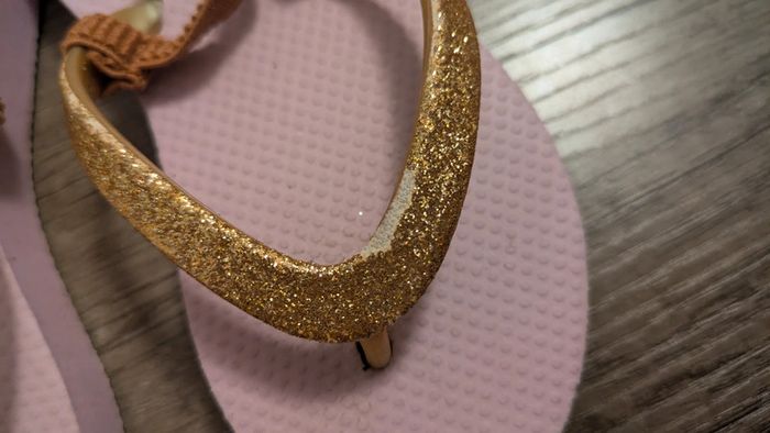 Elastiques pour retenir le péton, a paillettes. Il manque un morceau de paillettes (défaut de la chaussure) mais n'ont jamais servies.