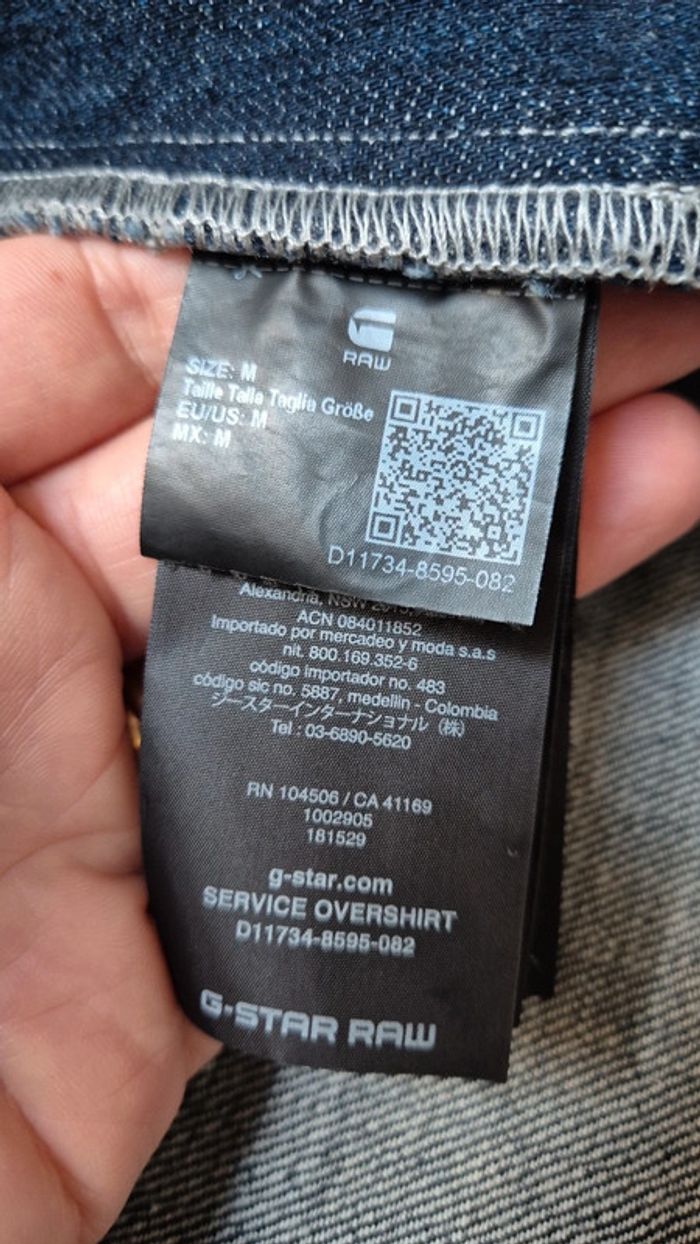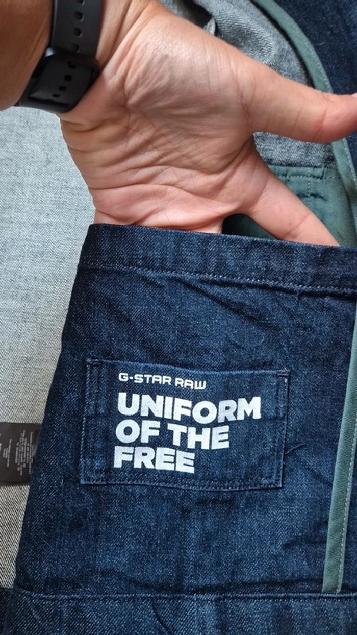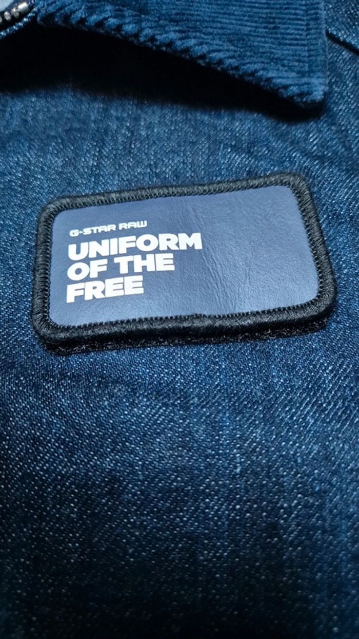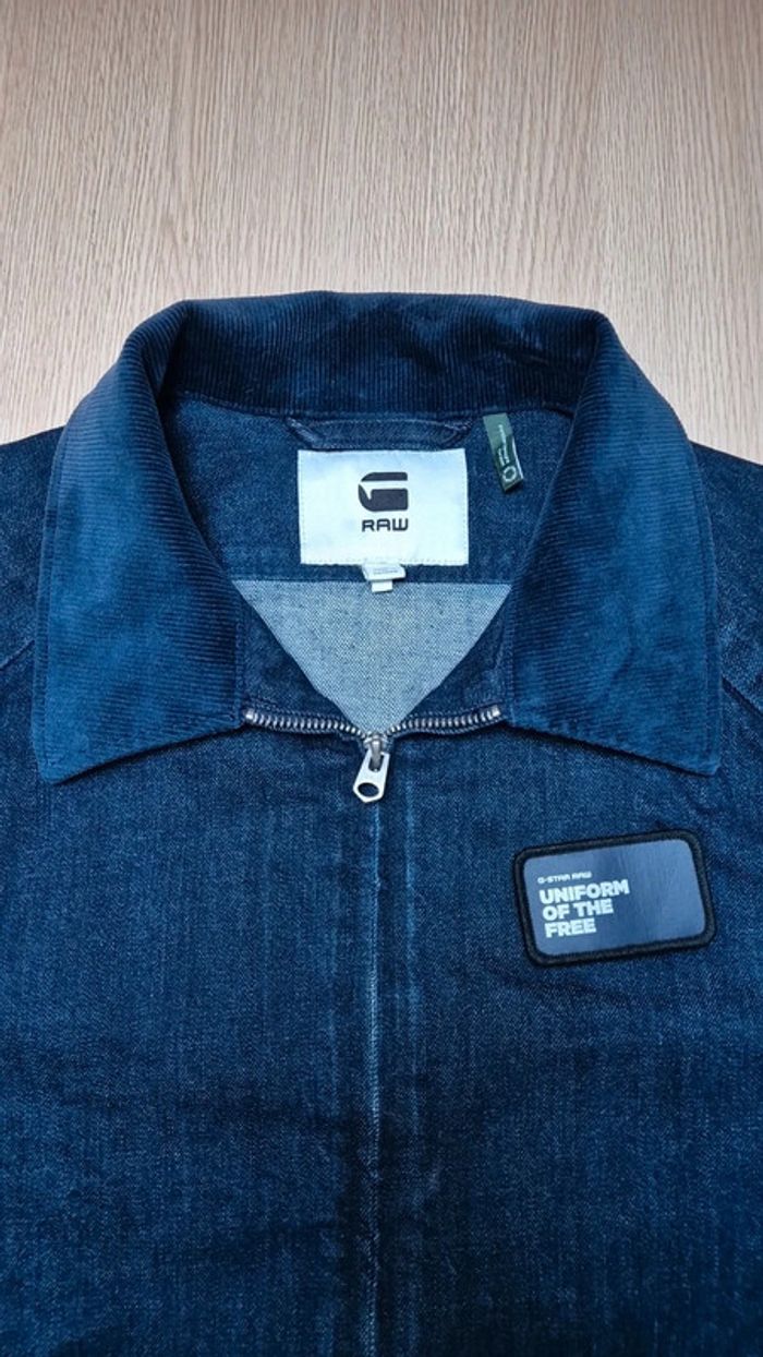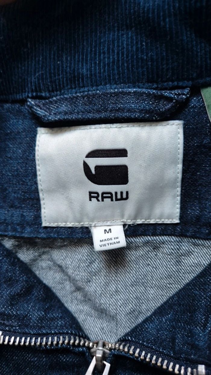 Veste denim brut G Raw Taille M Très bon état 2 poches à l avant + 1 grande poche intérieur. Écusson avec scratch à l avant. Col en velours bleu. Mesures ⬇️ Épaule à épaule : 44cm Aisselle à aisselle : 52cm Longueur : 66cm